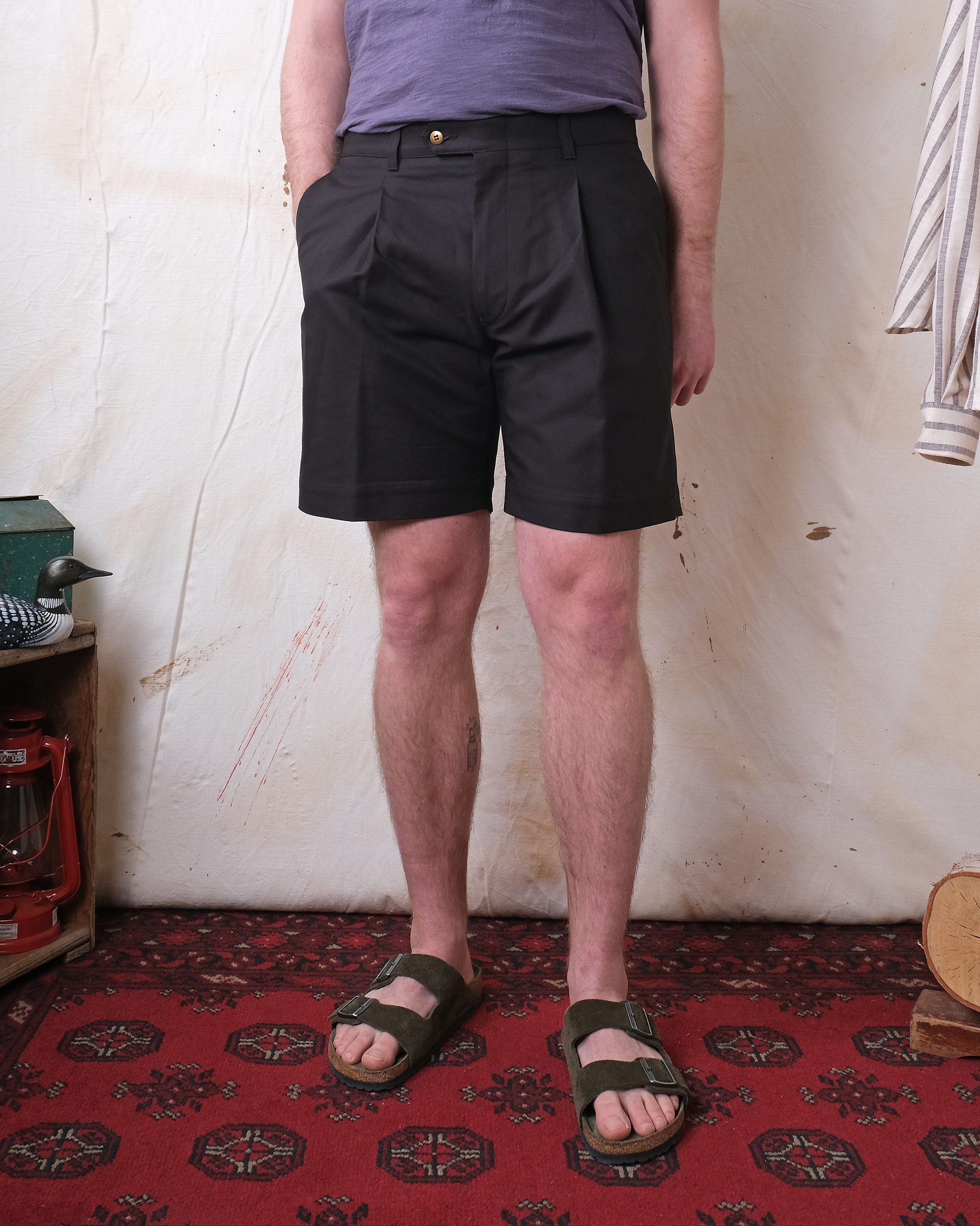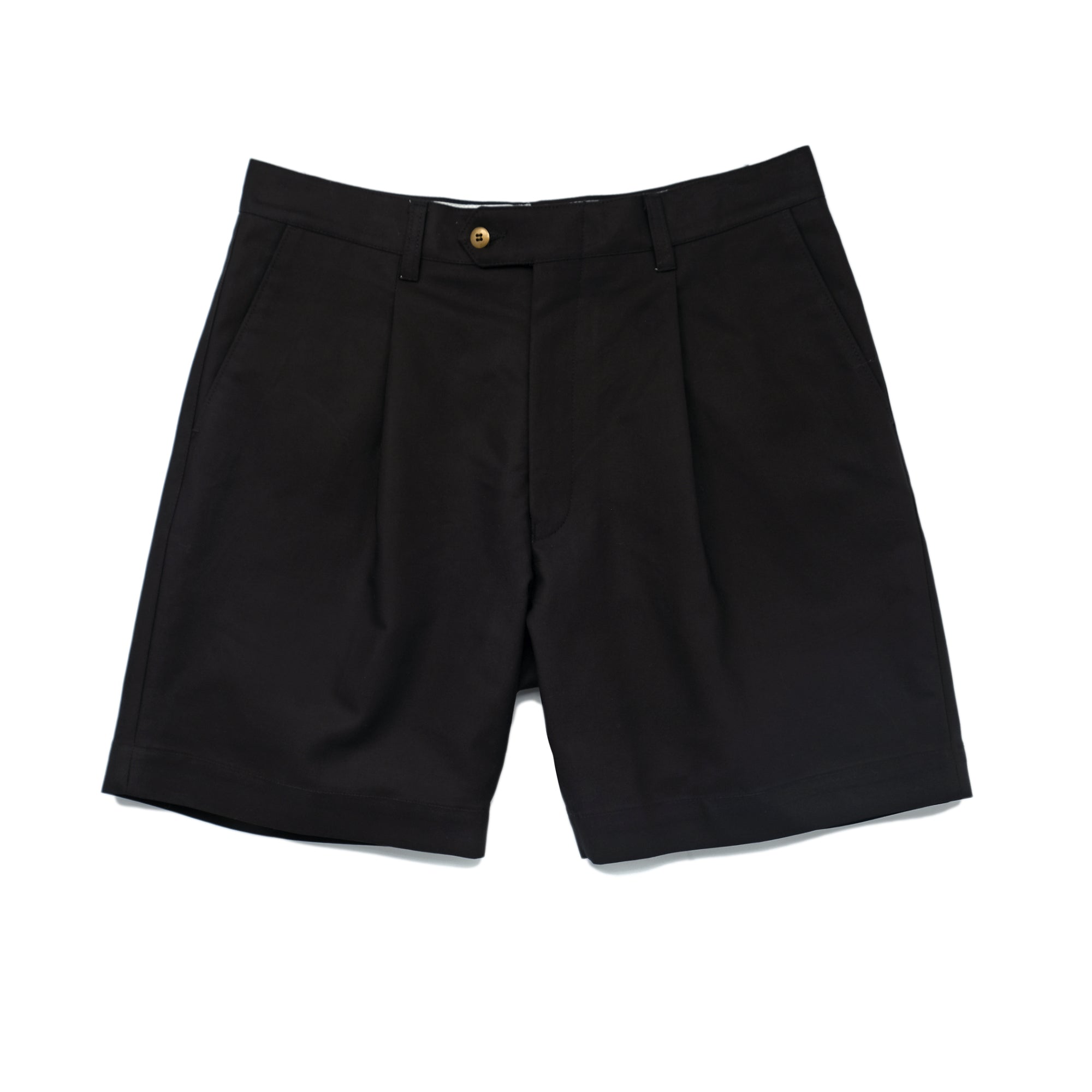 Crafted from premium Spanish sateen cotton, these Black Pleated Shorts deliver understated sophistication with real attention to detail. The tailored fit sits perfectly at the hip with subtle pleats that move with you, while functional hand pockets and a double-welt rear pocket keep things practical. A brass button closure adds a touch of quality that you'll notice every time you wear them.