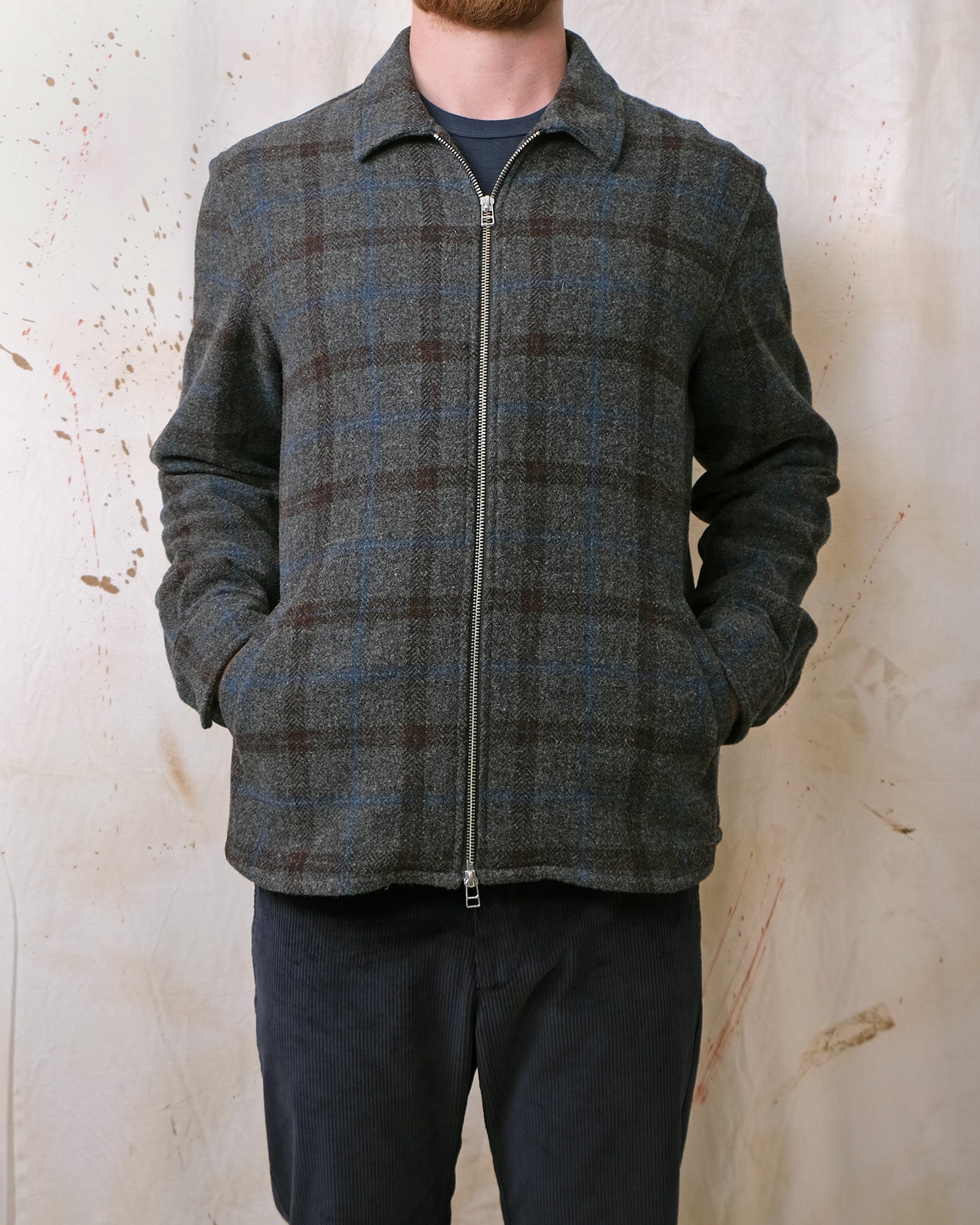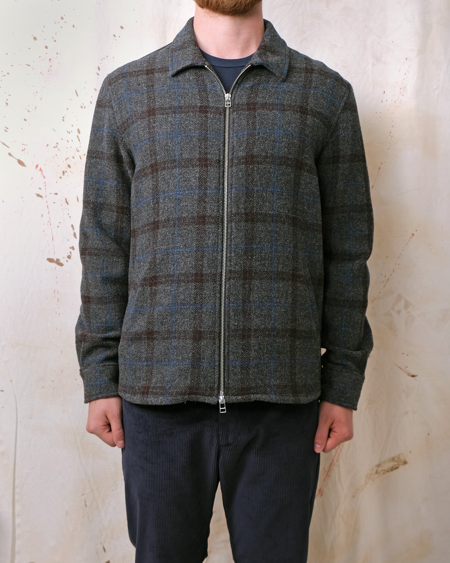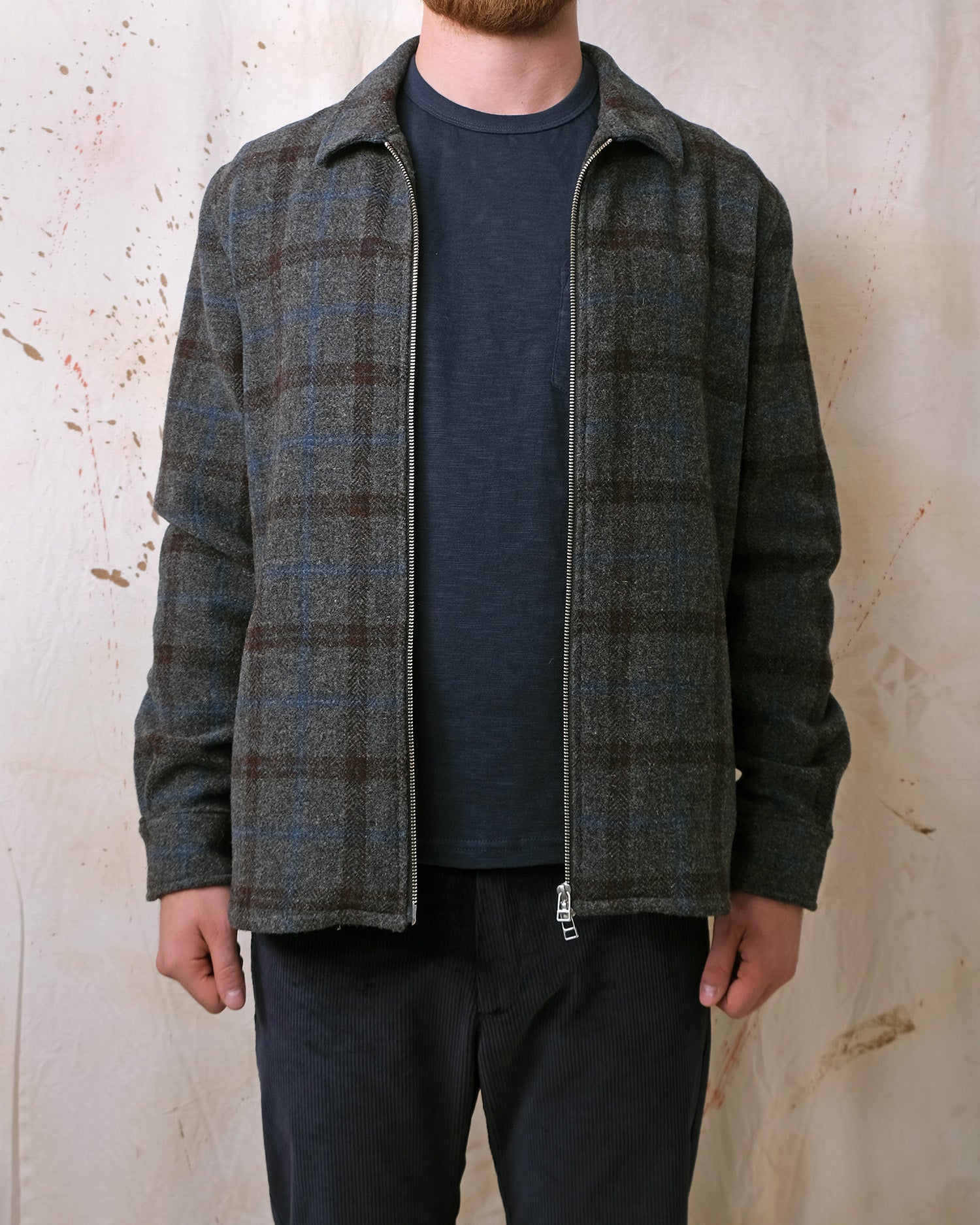 Crafted from Italian tweed-style virgin wool, the Grey Plaid Wool Zip Overshirt showcases a rich multi-coloured plaid design on a charcoal base. It offers a relaxed silhouette, flannel-lined single-welt hand pockets, a versatile two-way YKK zipper, and an elongated rear shirt-tail hem, ideal for layering.