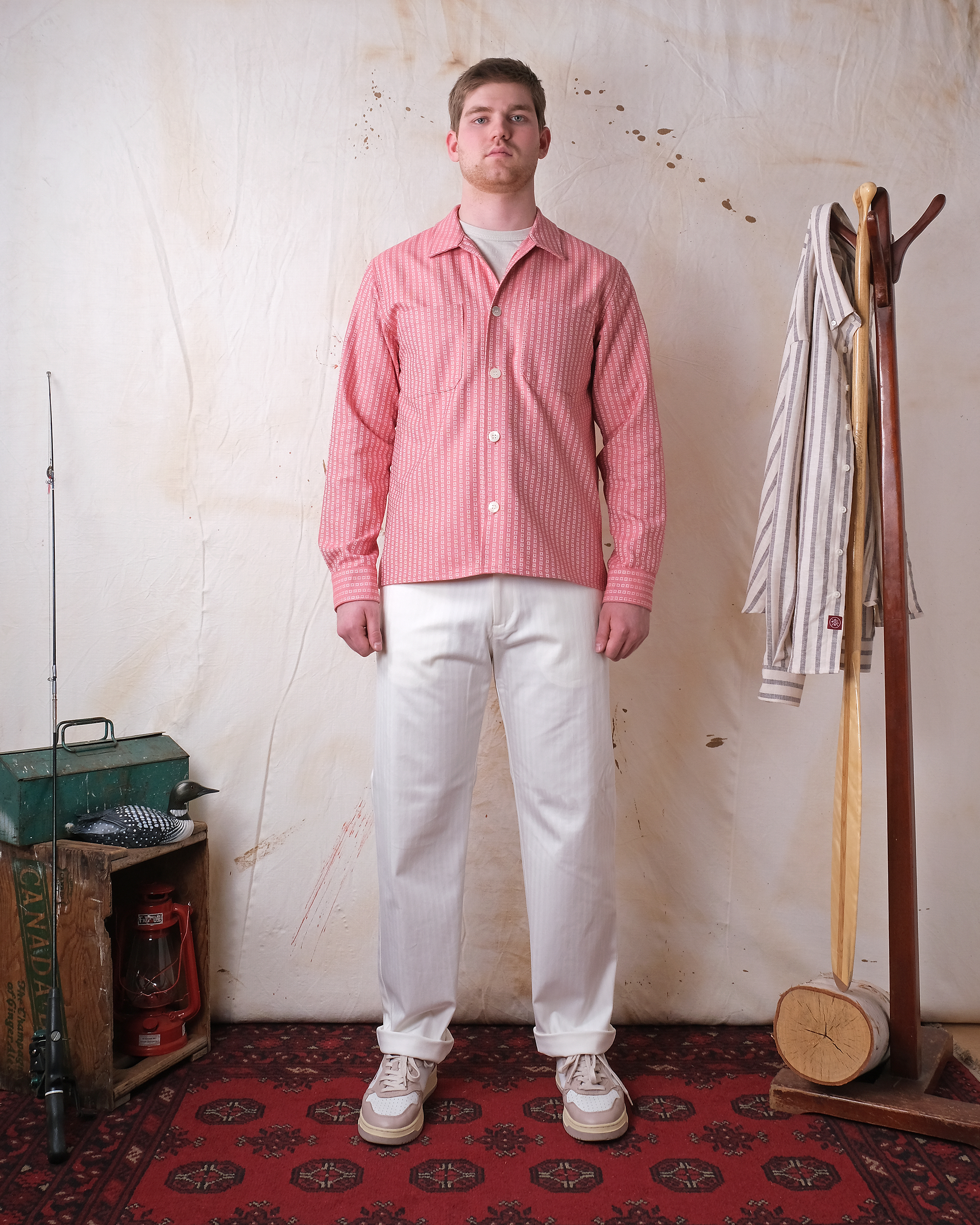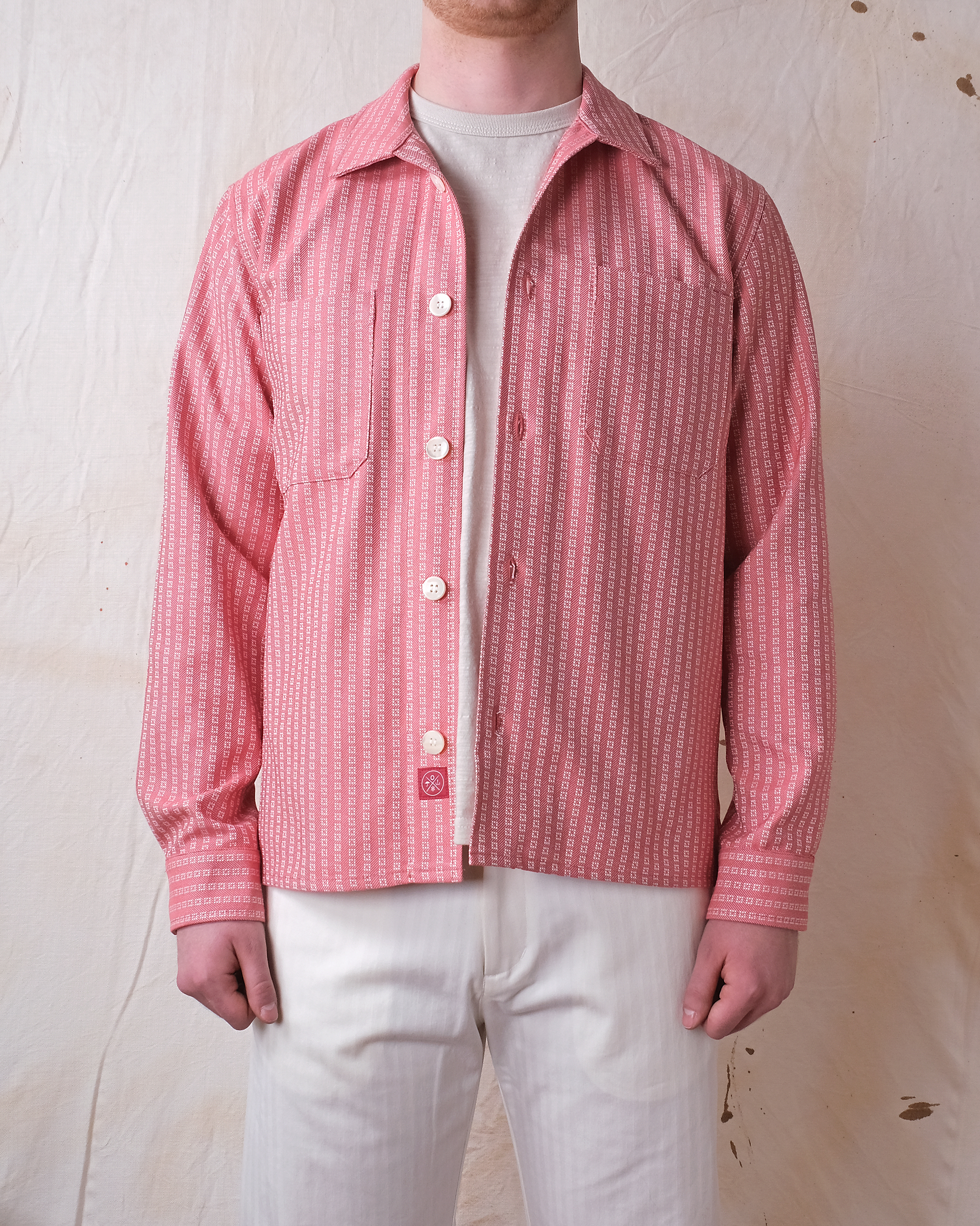The Salmon Jacquard Denim Club Shirt is built to layer and designed to last. Made from crisp Portuguese cotton, it features a woven geometric pattern throughout. Designed with a relaxed body, two breast pockets, and a straight hem, it balances practicality with style. Vintage white mother of pearl buttons provide a refined finishing touch.