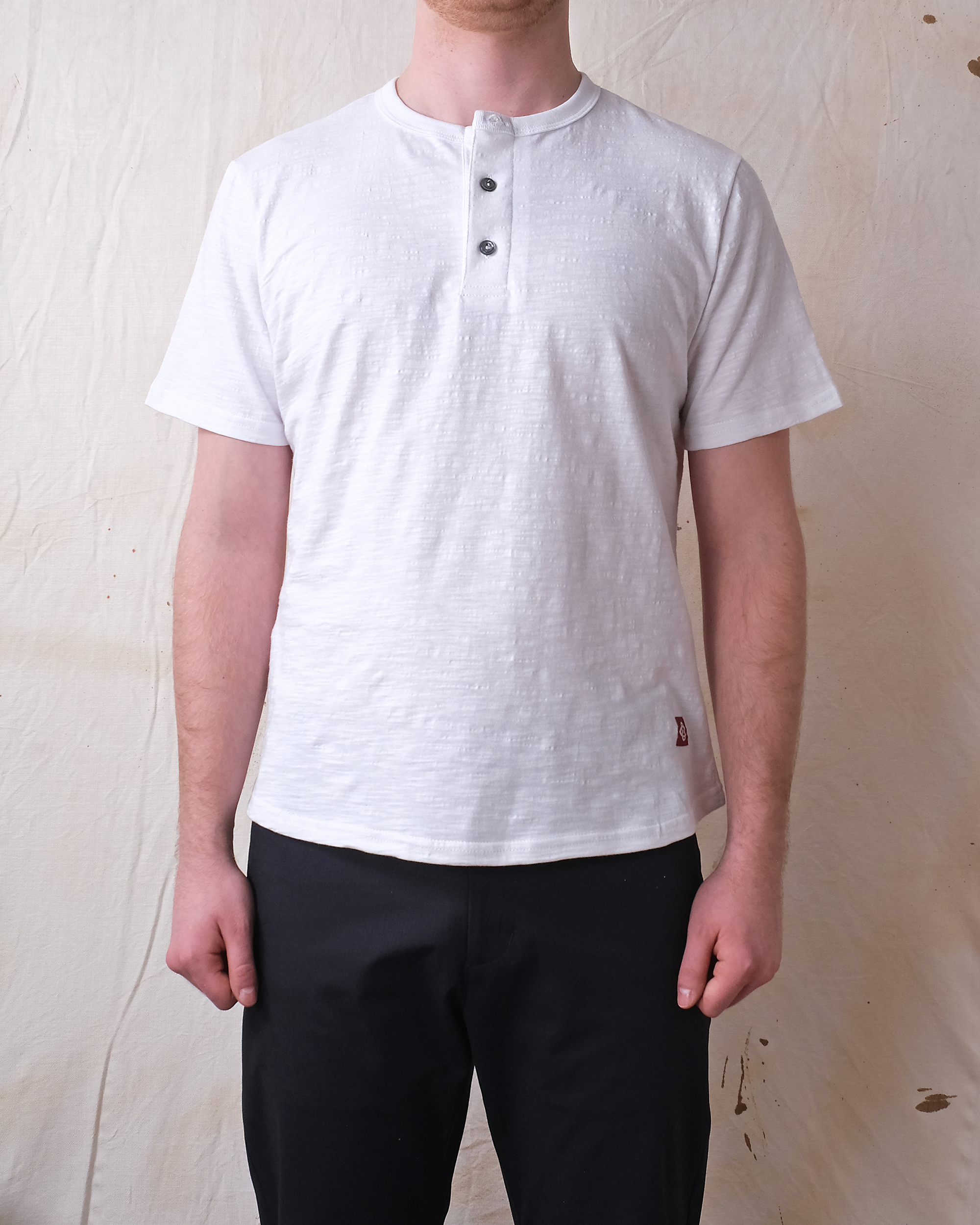 The White Slub S/S Henley is made with a Toronto-milled cotton jersey fabric. The henley sports a slim fit, grey mother of pearl buttons and a rounded hem. Crafted from premium 100% cotton jersey, this versatile henley delivers exceptional comfort and breathability for everyday wear. The refined slim fit flatters your frame while the subtle texture of the slub weave adds visual interest and dimension. Size up for a more relaxed fit.