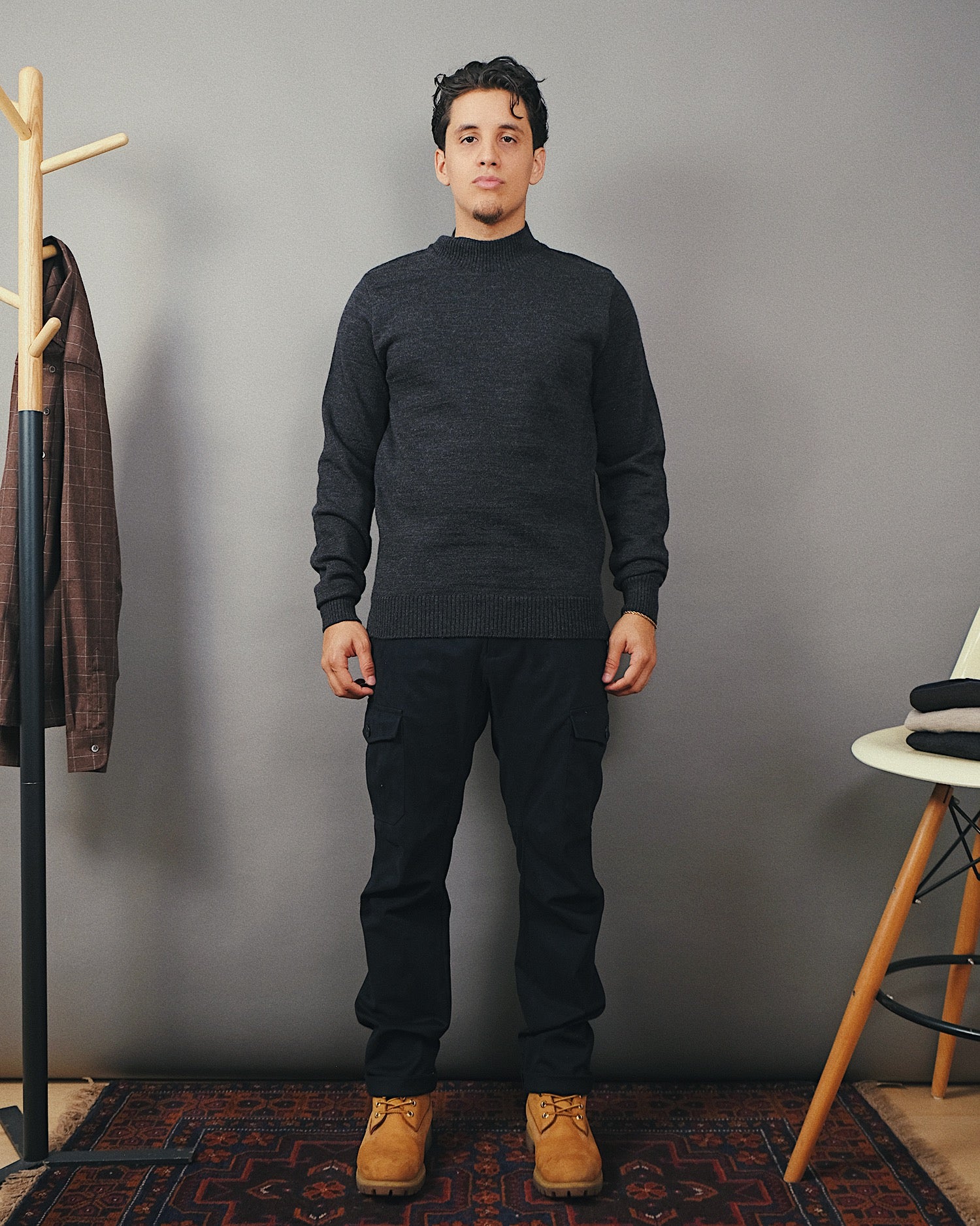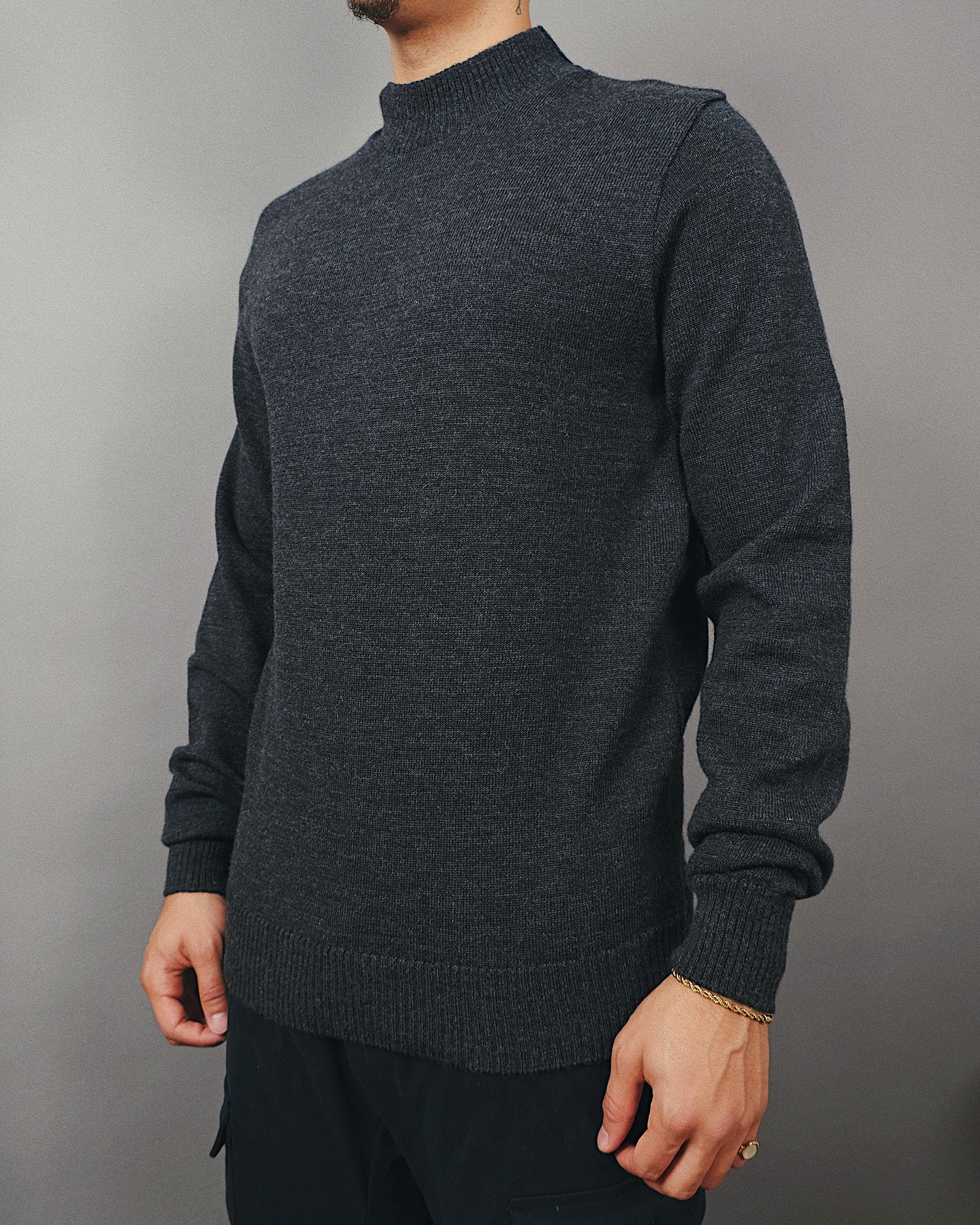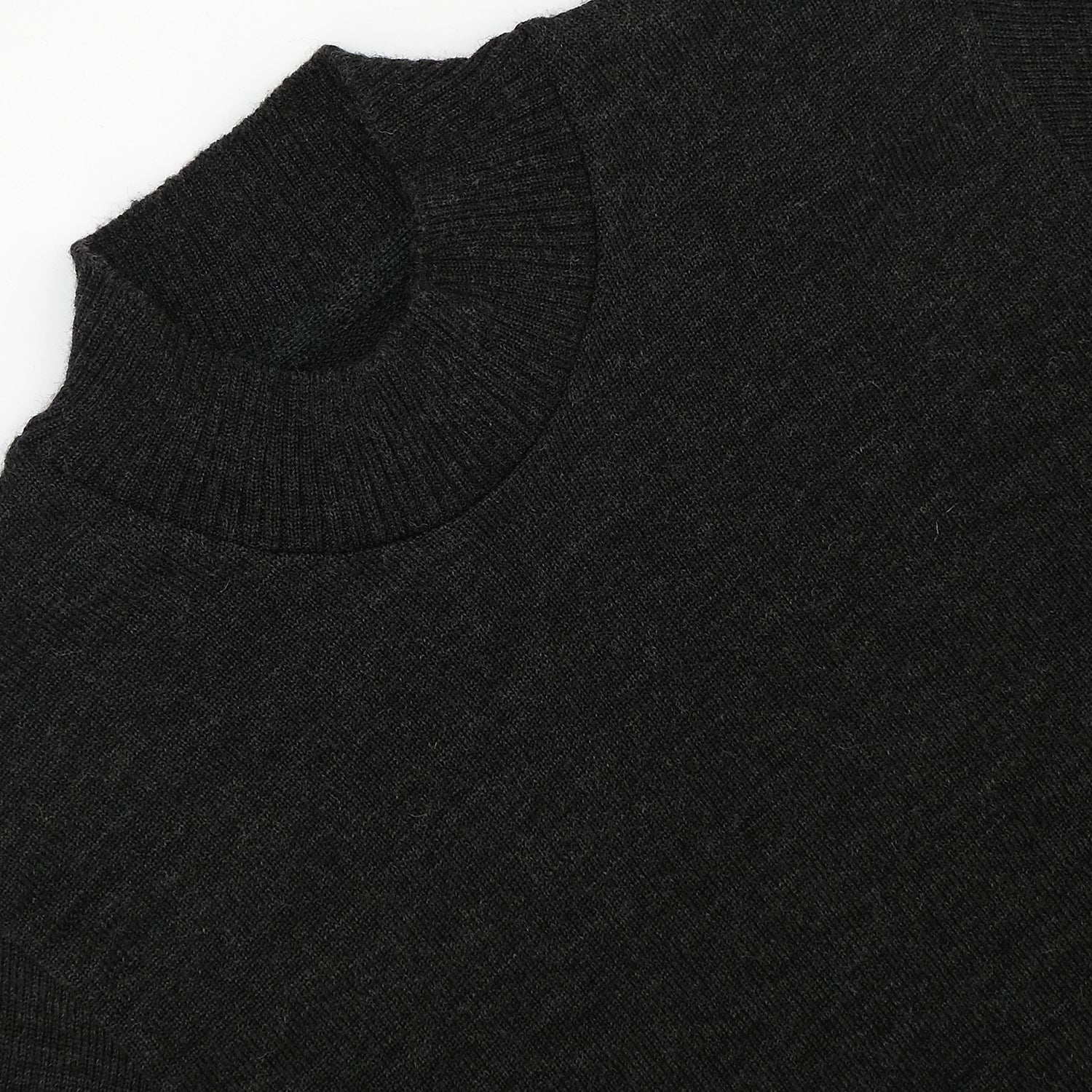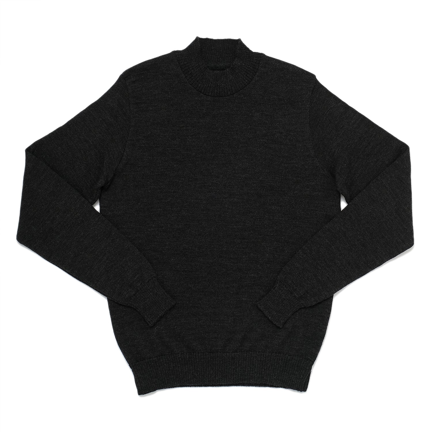 Embrace comfort and style in the Charcoal Mockneck Pullover Sweater. Made from a soft Merino wool yarn from Germany, this sweater boasts a relaxed fit with a ribbed mockneck collar, cuffs and waistband.