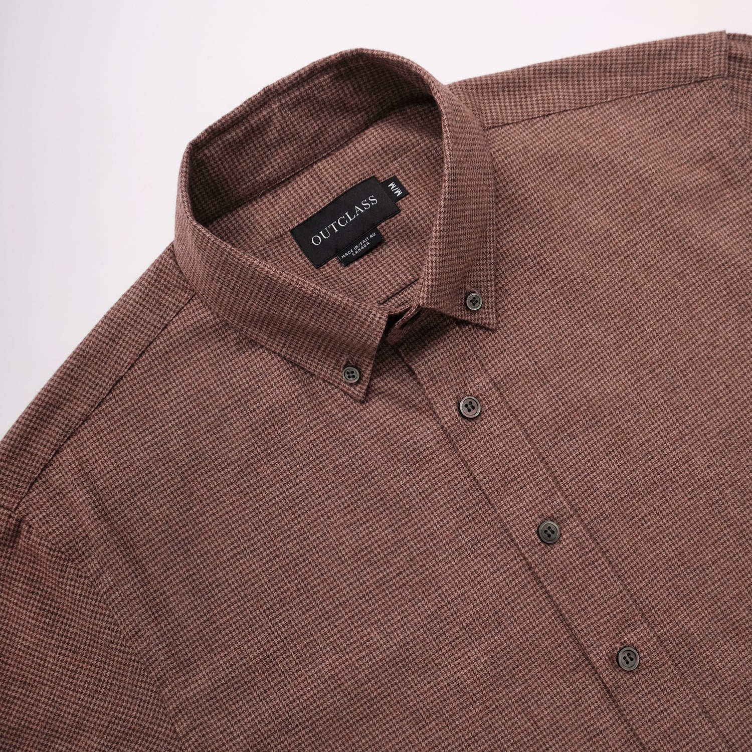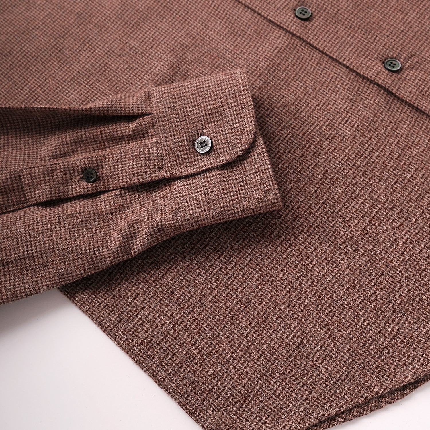 This shirt is crafted from a soft Portuguese flannel fabric featuring a houndstooth pattern, double-needle seams, a button-down collar, and grey mother of pearl buttons for an elegant look.