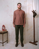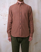 The Rust Herringbone Flannel Shirt is made with an ultra-soft flannel fabric from Portugal with subtle herringbone stripes throughout. The shirt sports a relaxed fit, button-down collar and grey mother of pearl buttons.