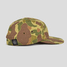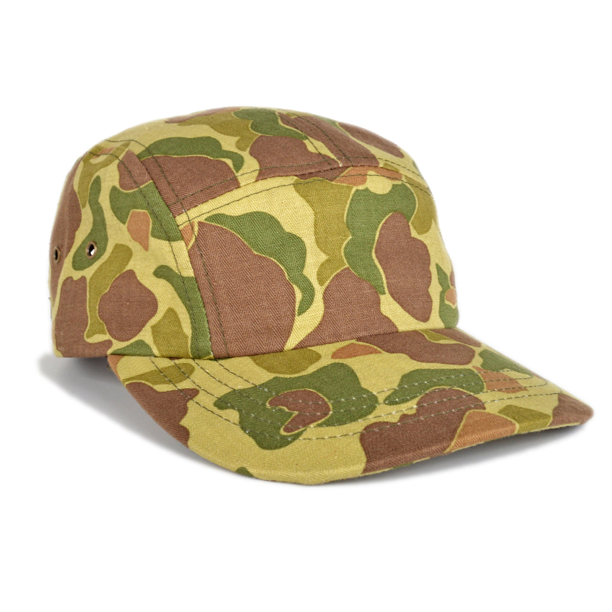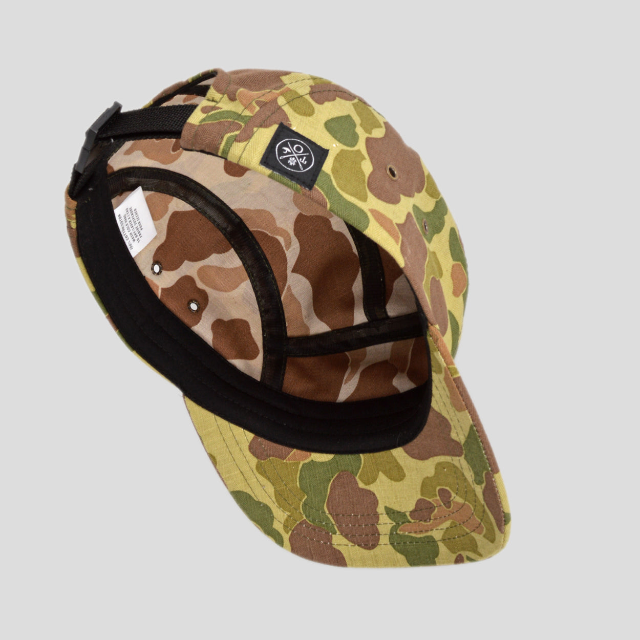 This cap is made using a cotton herringbone fabric from Japan that features a Frogskin Camo pattern throughout. The cap is finished with a nylon adjustable strap and an Outclass crest label on the back, right side of the cap.