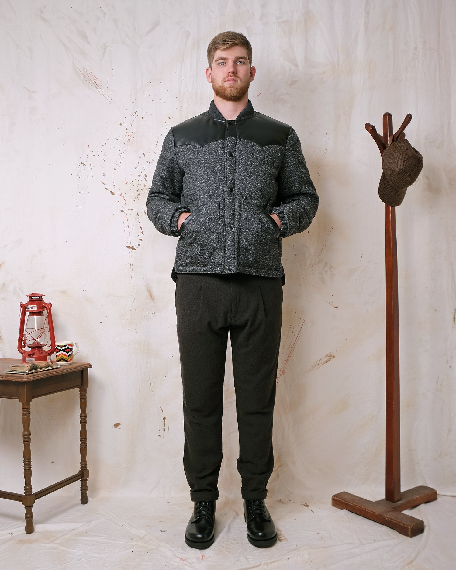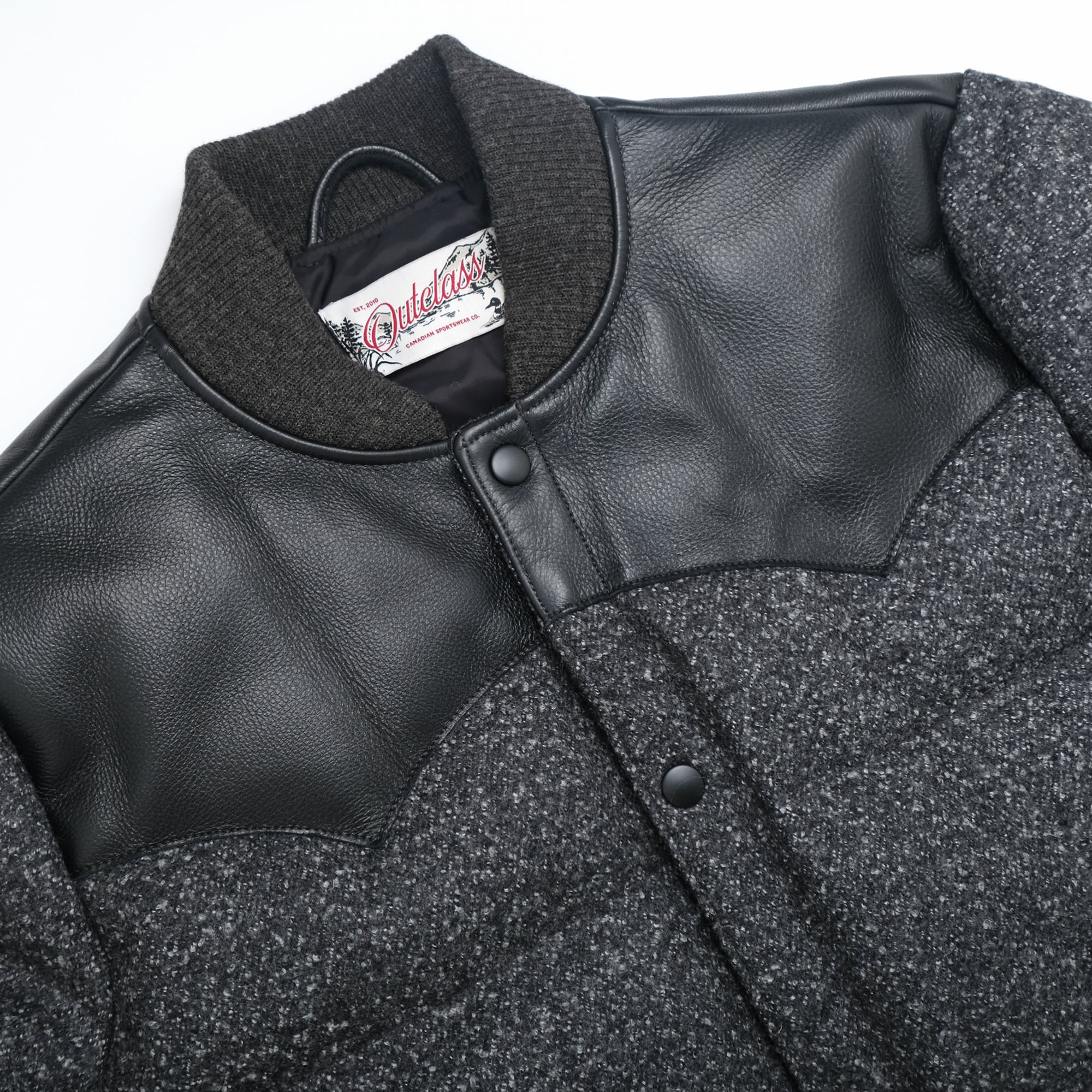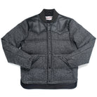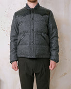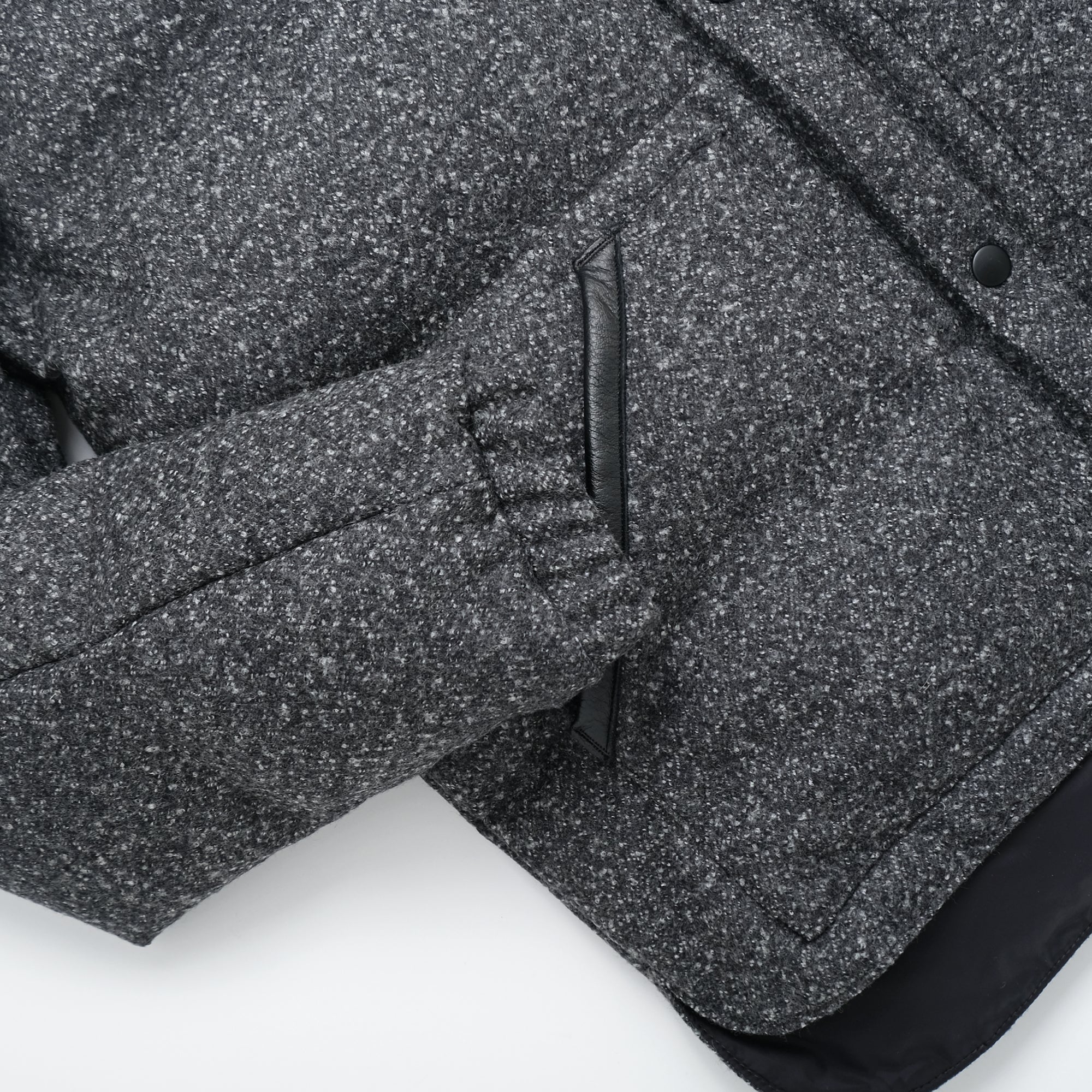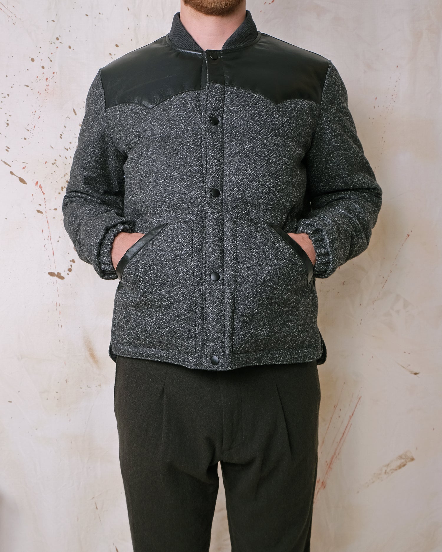 Heritage-inspired and purpose-built, the Black Marl Wool Down Jacket is ready for your next outdoor adventure. Made from Italian marl wool, it features 700 fill power insulation (90% down, 10% feathers) for serious warmth. Genuine leather on the front and back yoke adds durability. Hand pockets with leather trim, a ribbed collar, and black metal snaps complete the jacket with functional style.