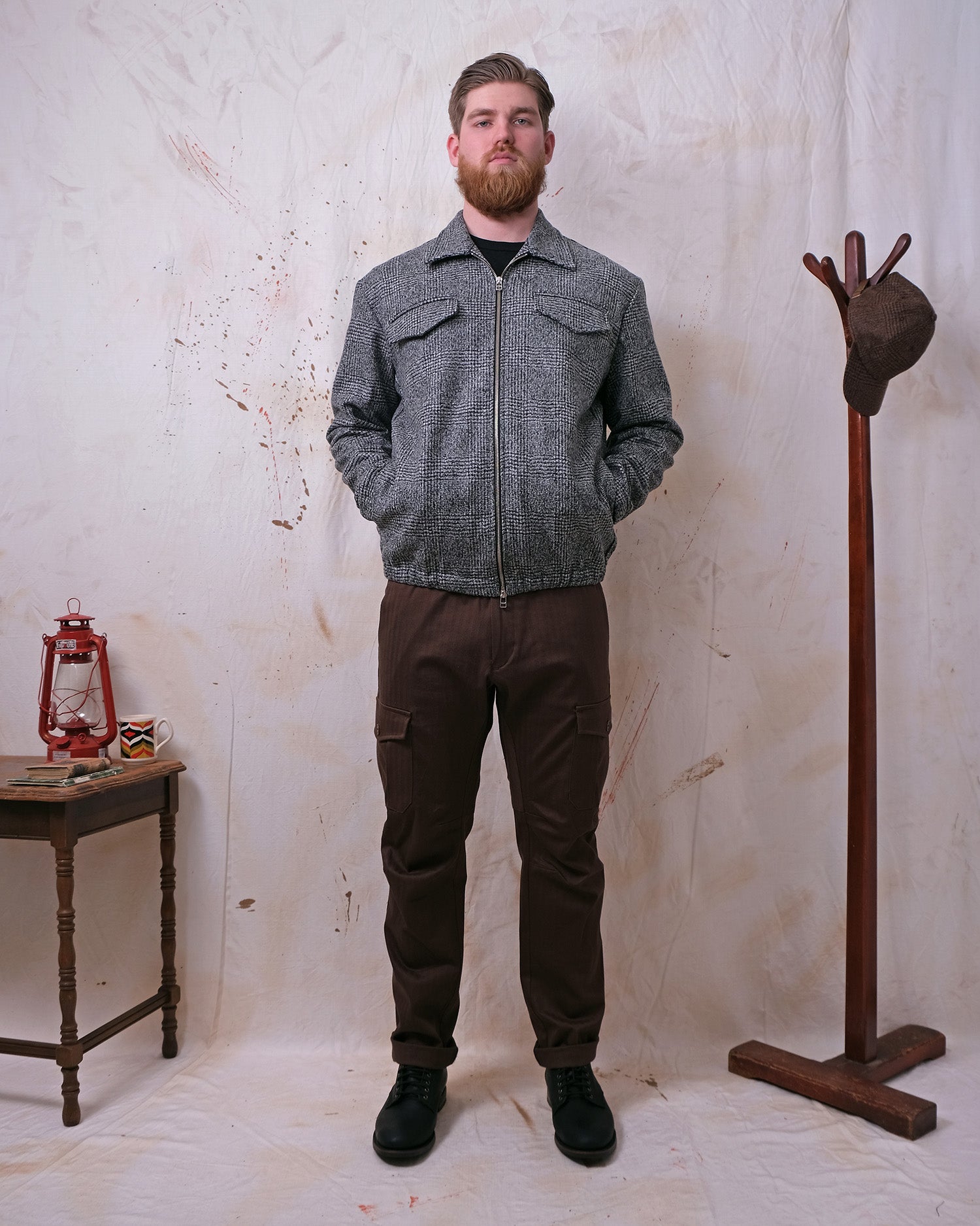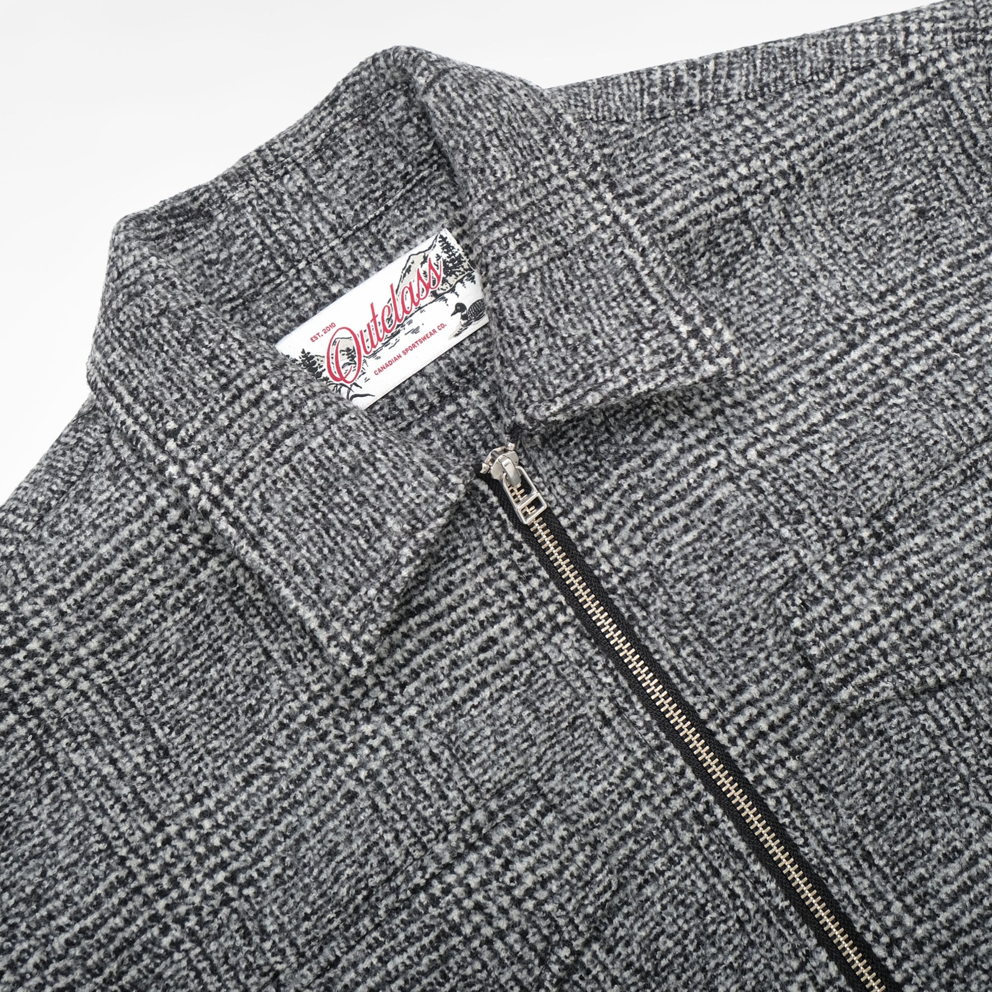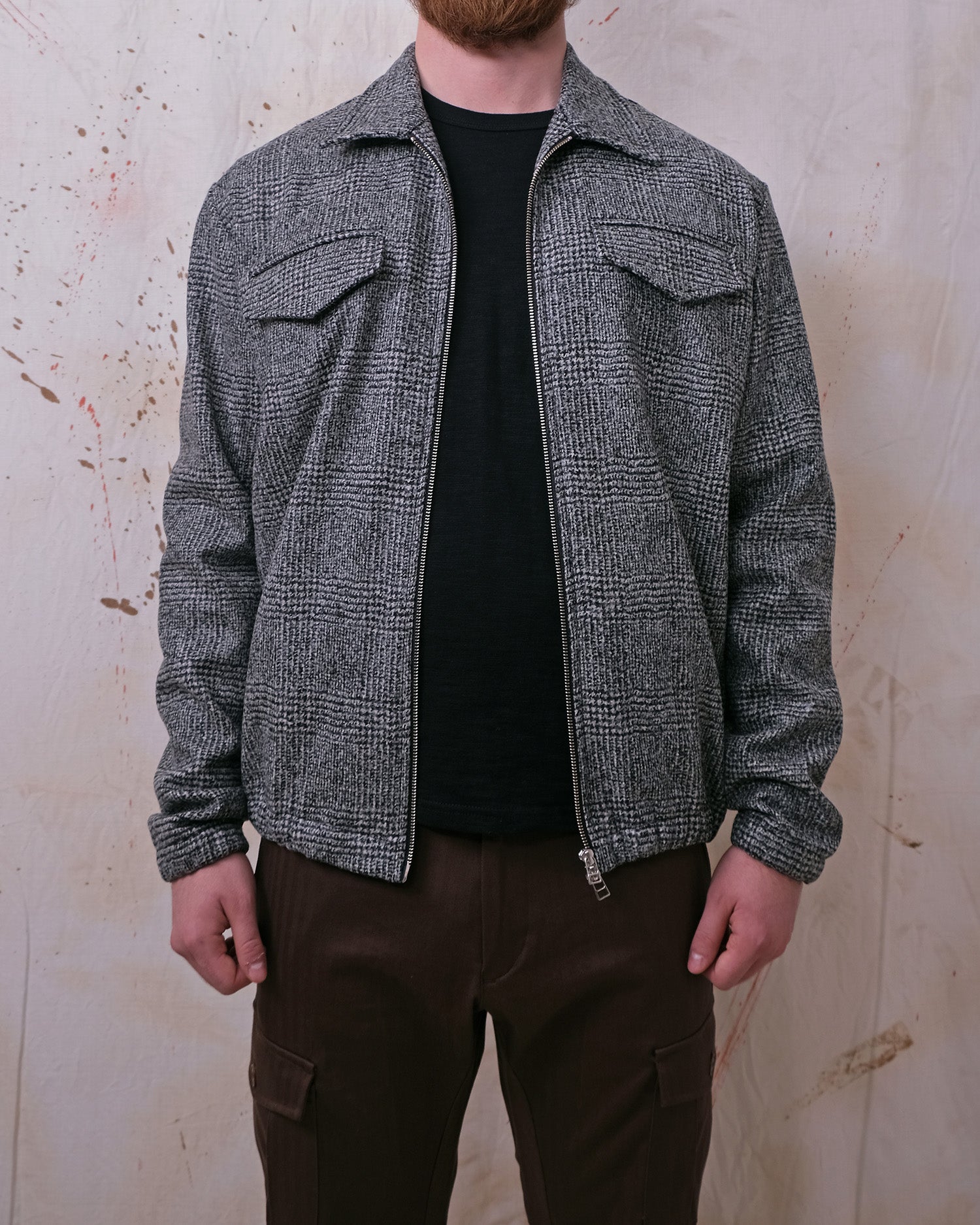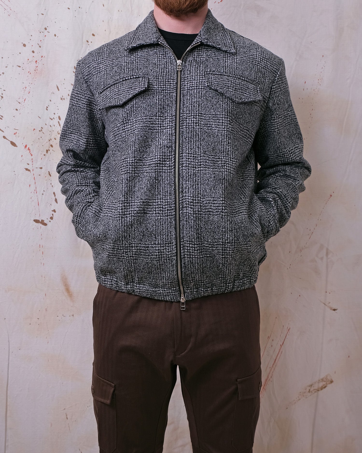 The Black and White Bouclé Coach Jacket is made with a premium wool from Italy that features a plaid pattern throughout. The jacket sports a boxy fit, in- seam hand pockets, two breast pockets with flaps, and a two-way YKK zipper.