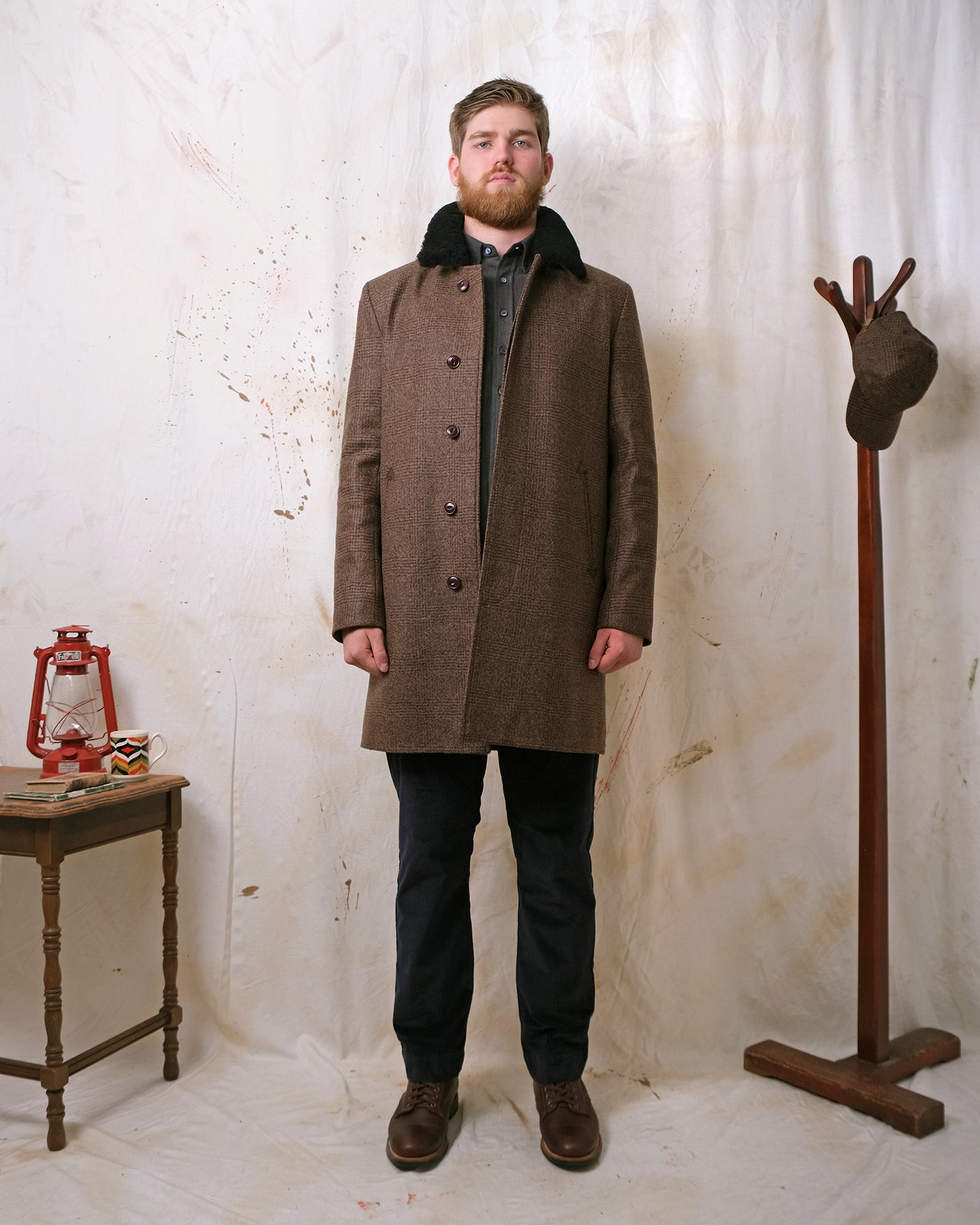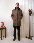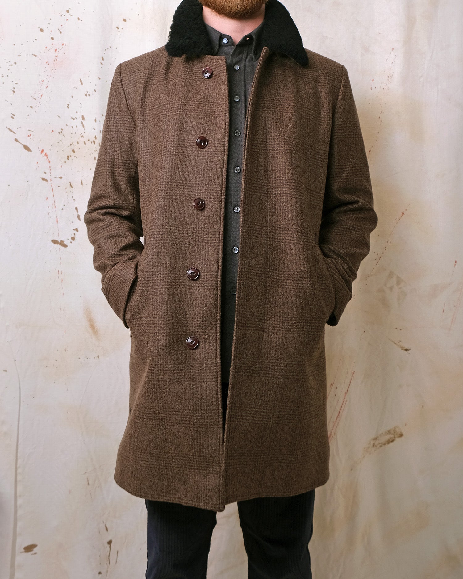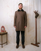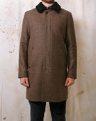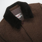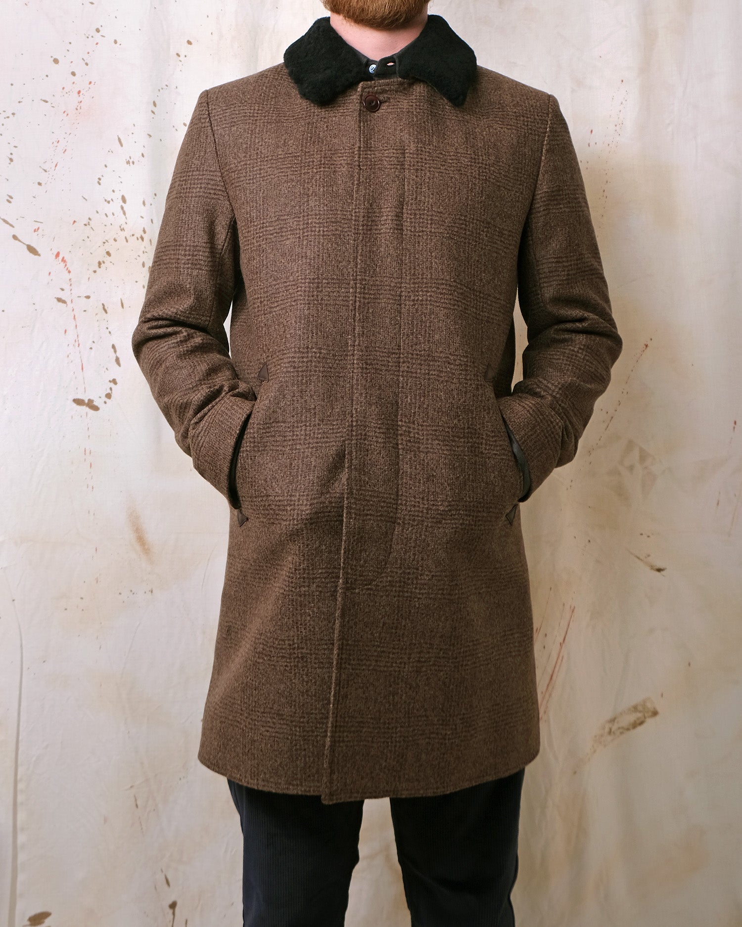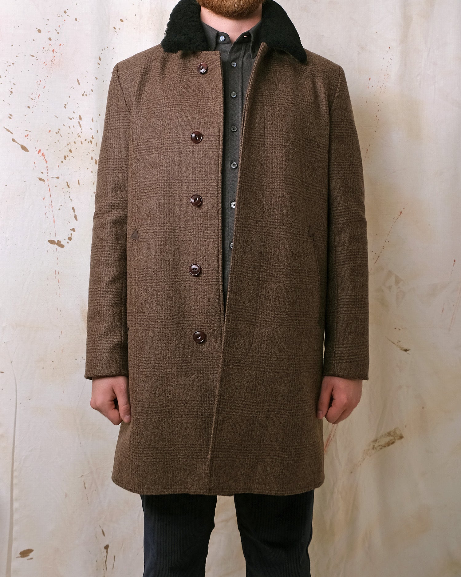 Crafted from premium Italian wool, the Brown Bouclé Plaid Mac Coat showcases an elegant plaid design. It features a tailored silhouette, a genuine shearling collar, double-welt hand pockets accented with leather trim, and brown corozo nut buttons. The coat is lined with luxurious Japanese cotton-rayon fabric adorned with a distinctive fishing motif.