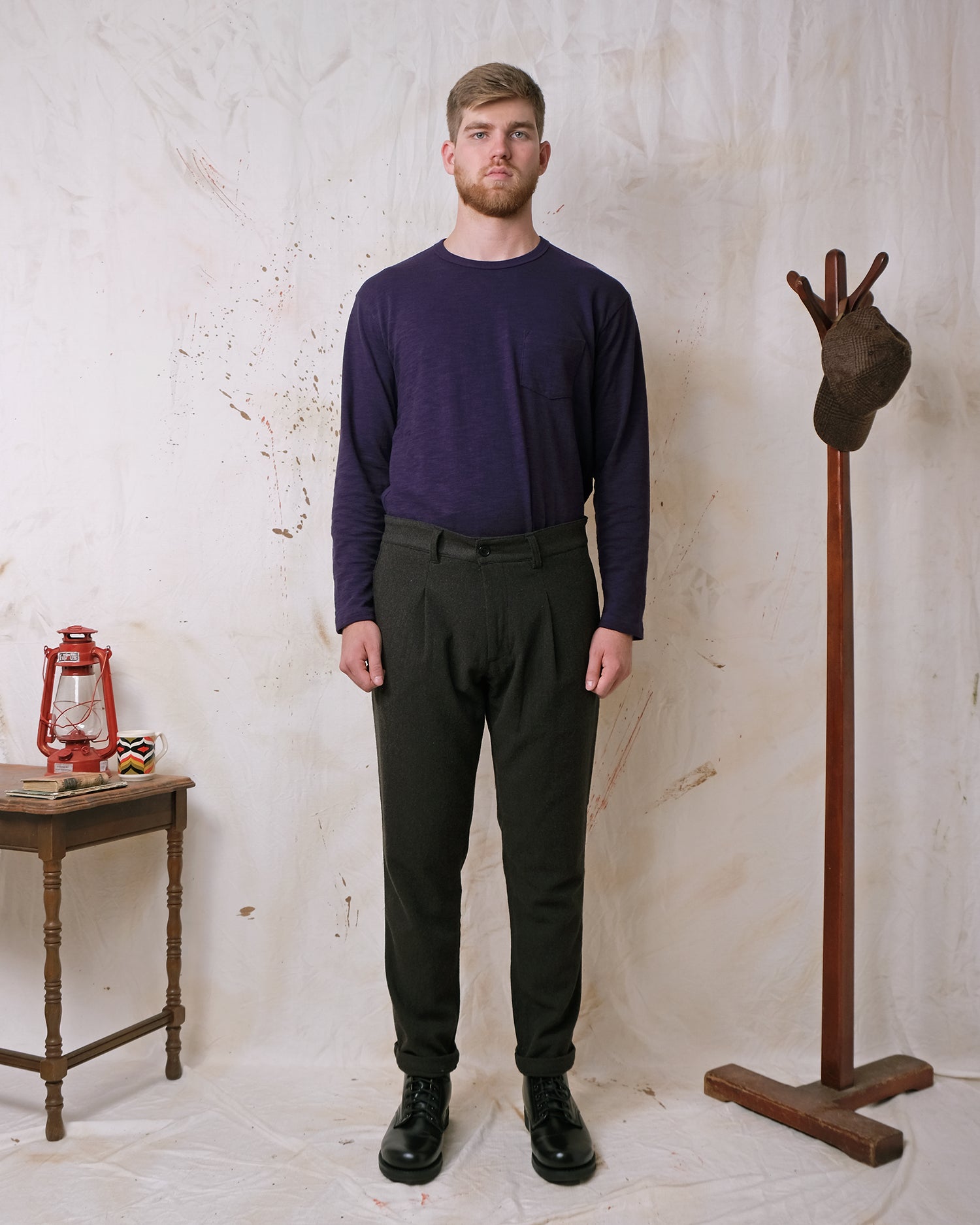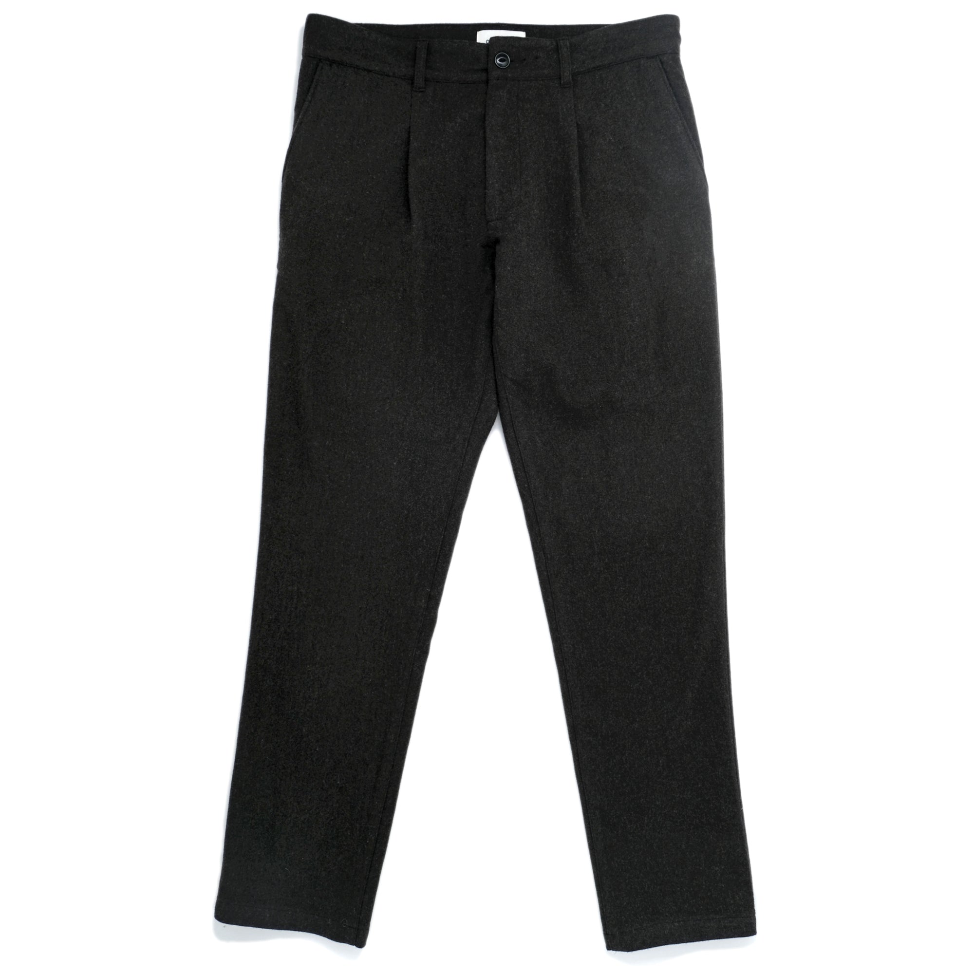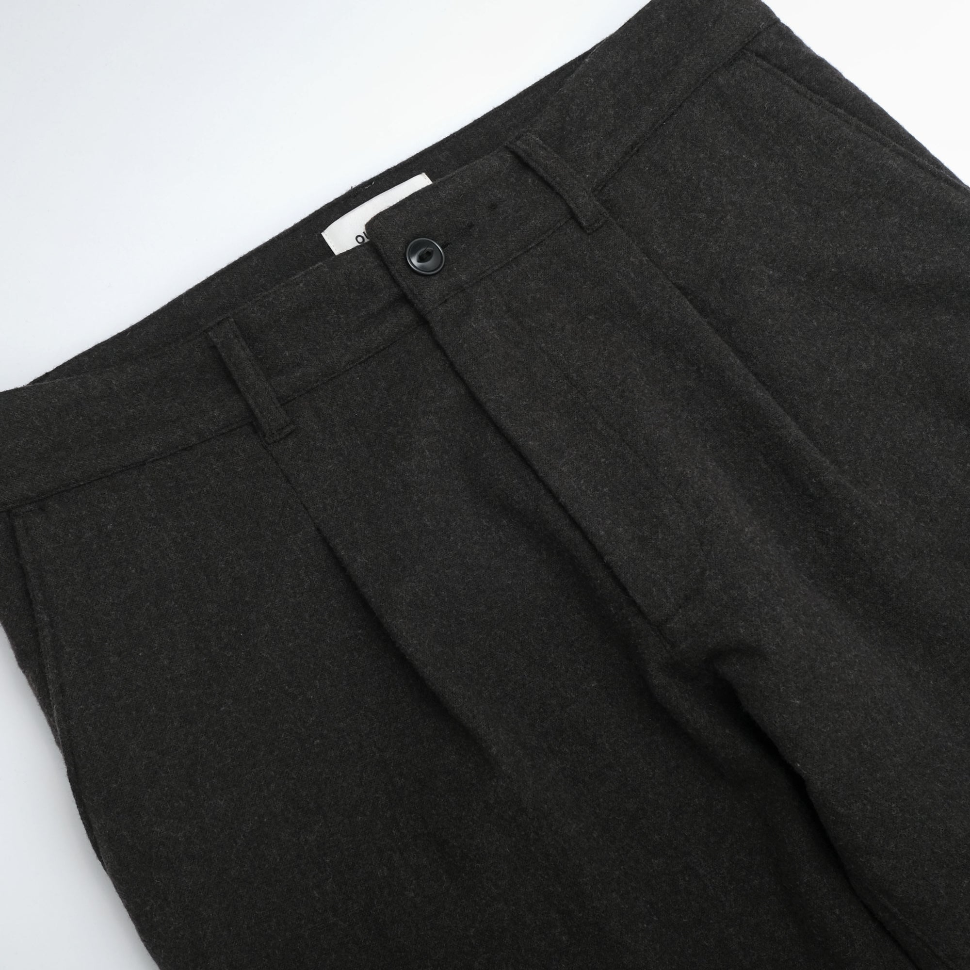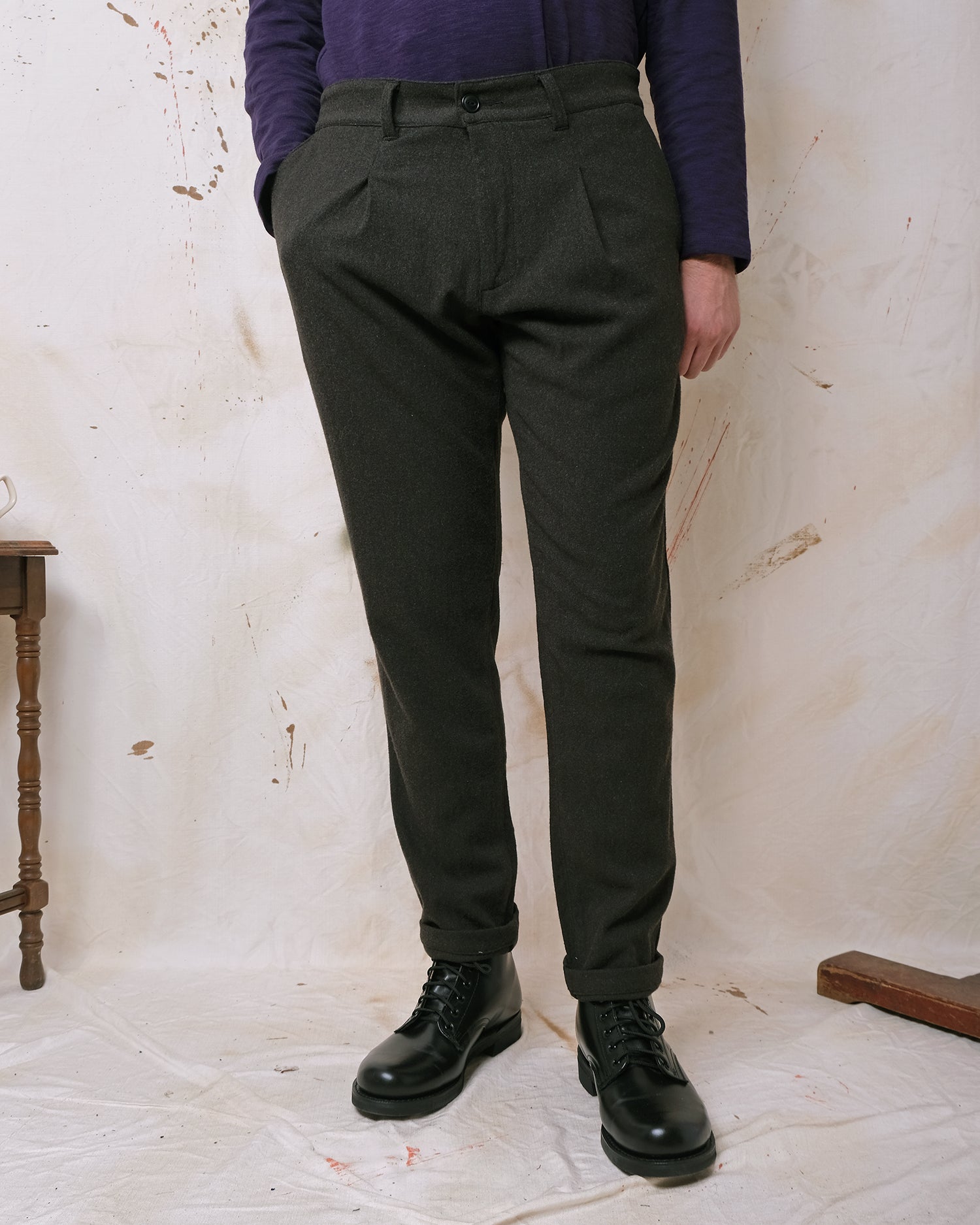 Made from soft Italian washable wool, the Charcoal Pleated Pant offers warmth and sophistication in a relaxed fit. Designed with hip pleats, a zipper fly, and corozo nut button closure, it delivers a tailored look with effortless wear. The washable wool fabric adds practicality, making it an easy choice for everyday life.