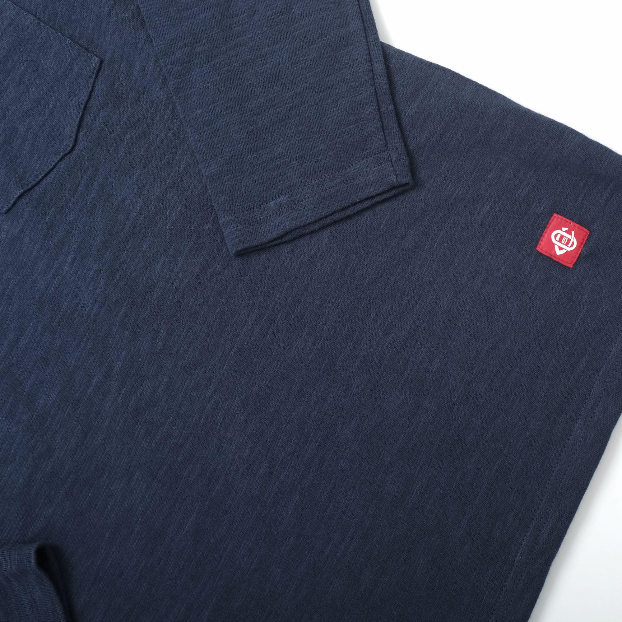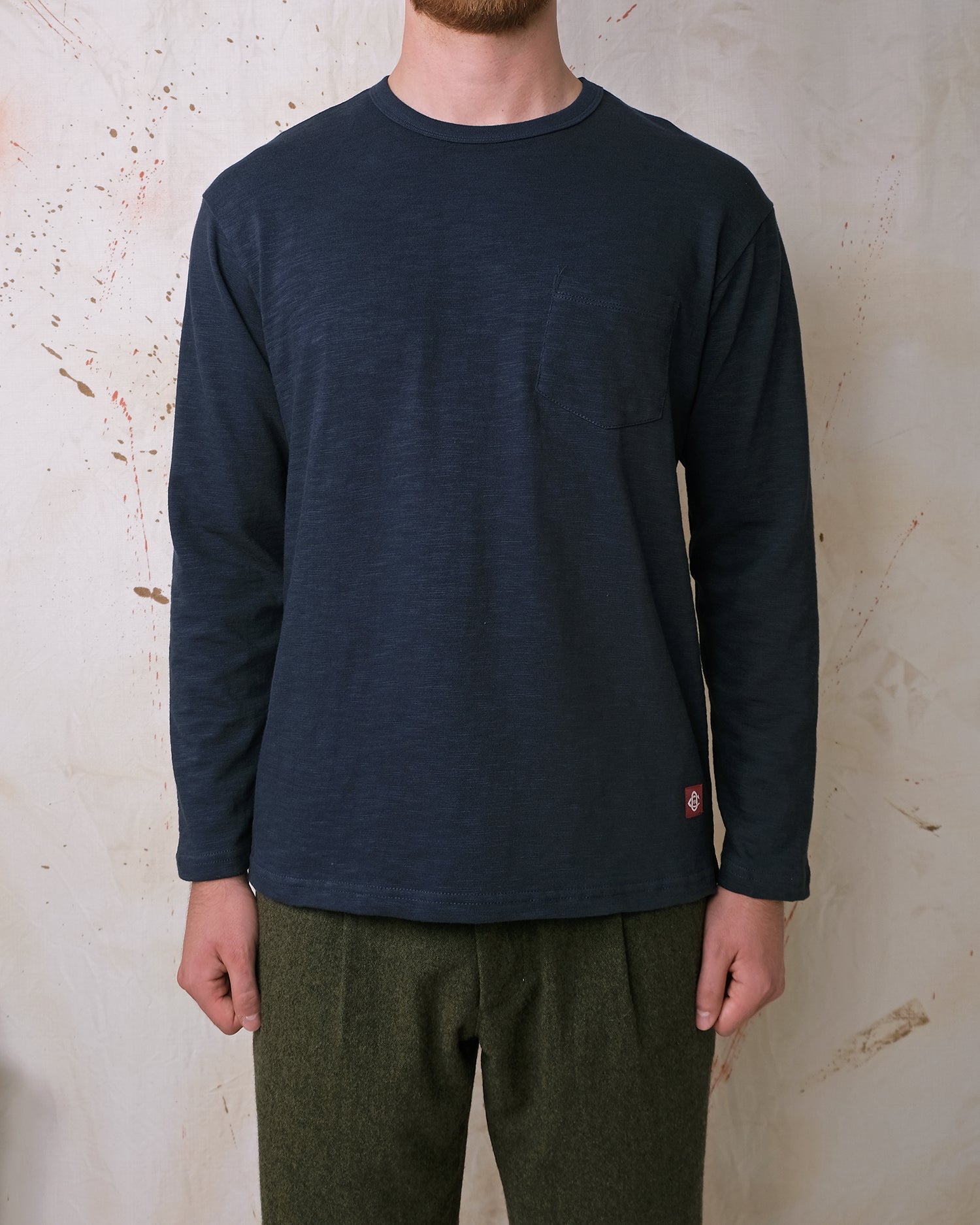 Made in Canada from start to finish, the Double Slub L/S Pocket T-Shirt is made from Toronto-milled double-jersey cotton, dyed, cut, and sewn domestically. With a relaxed fit, chest pocket, and straight hem, it combines local craftsmanship with everyday comfort and style.