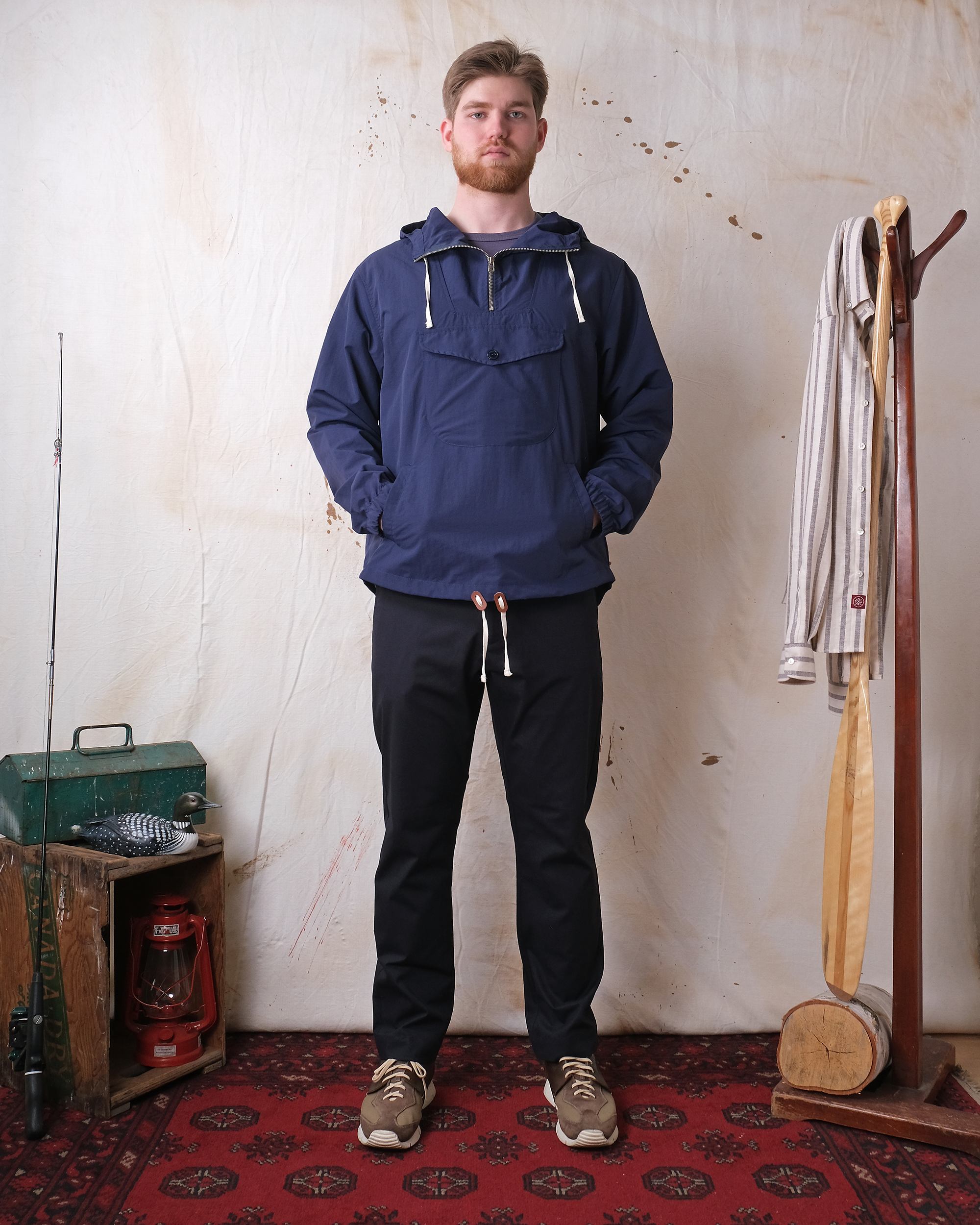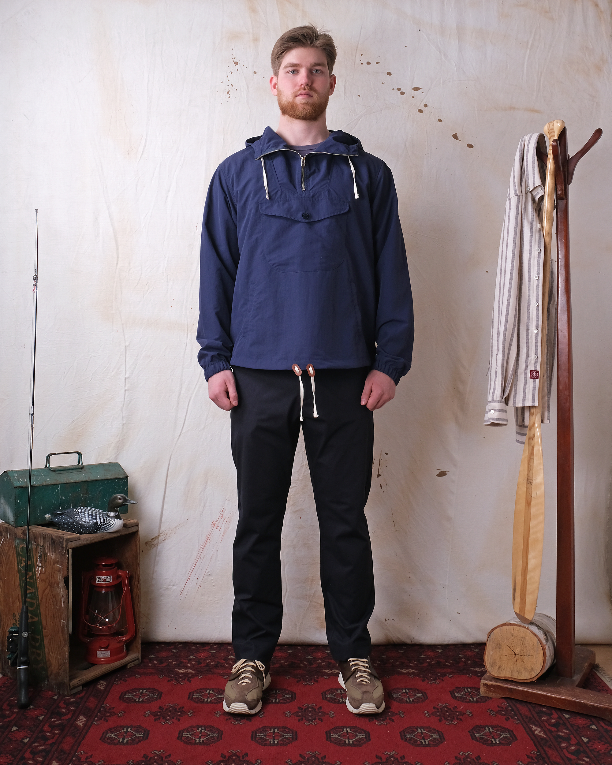 The Navy Nylon Anorak is built to handle whatever the weather throws at you. Made from quality Spanish nylon, this piece has a relaxed fit that layers perfectly over anything in your closet. The three-piece hood adjusts to fit just right, while the kangaroo hand pockets keep your essentials close. You get a bonus storage pocket too, plus drawstrings at the hood and hem finished with leather trim for that extra touch. It's the kind of jacket you'll reach for constantly because it's practical, looks good, protects you from all the elements.