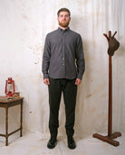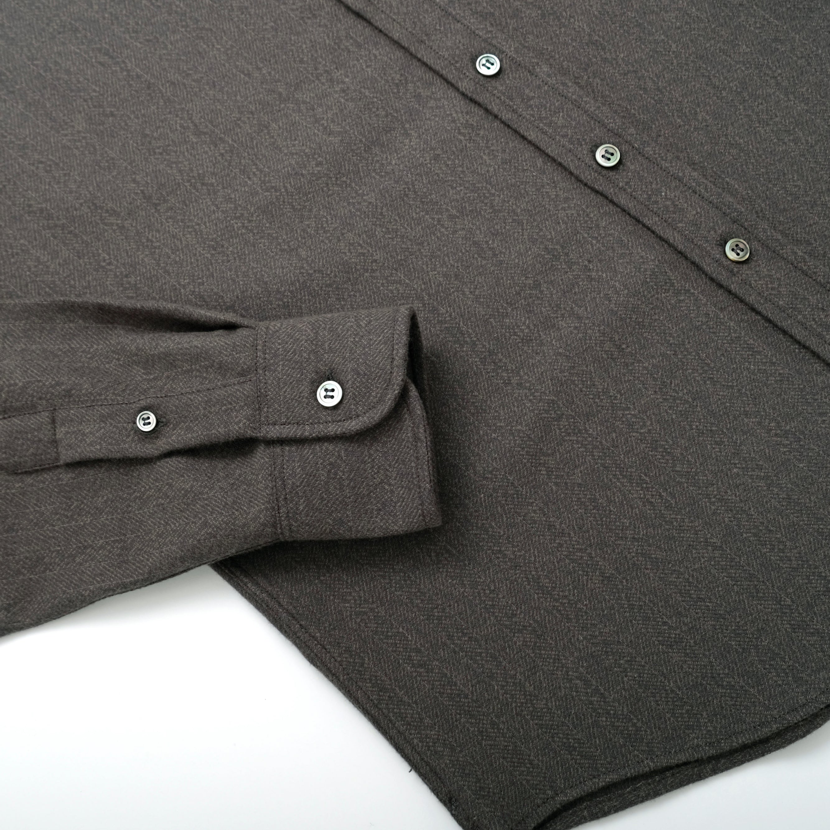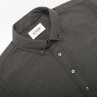 The Olive Herringbone Flannel Shirt is made with an ultra-soft flannel fabric from Portugal with subtle herringbone stripes throughout. The shirt sports a relaxed fit, button-down collar and grey mother of pearl buttons.