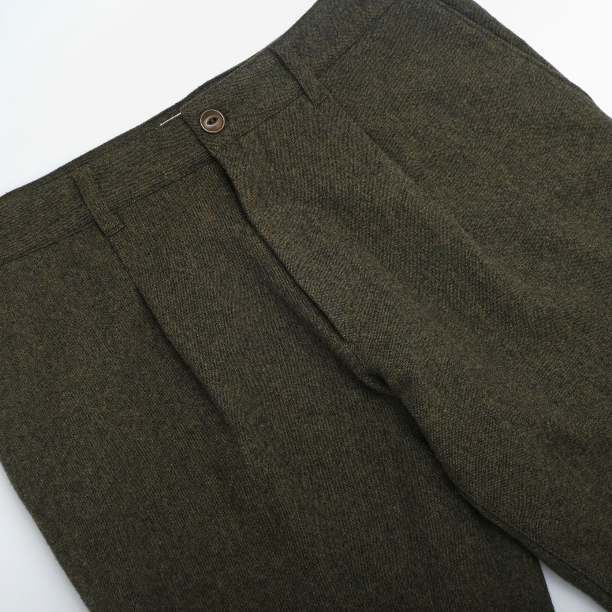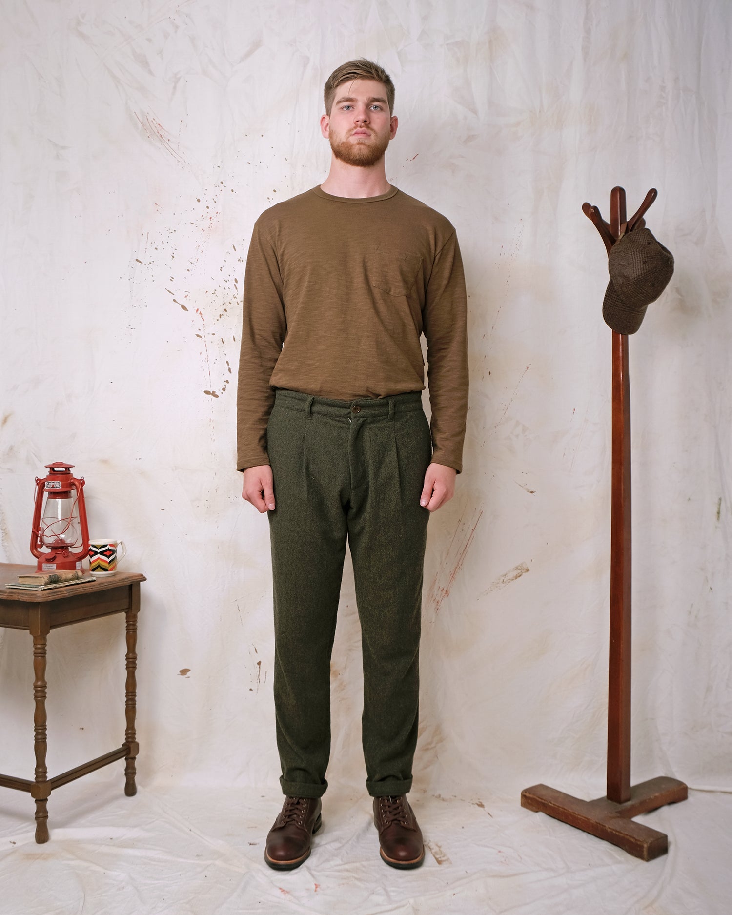 Made from soft Italian washable wool, the Olive Pleated Pant offers warmth and sophistication in a relaxed fit. Designed with hip pleats, a zipper fly, and corozo nut button closure, it delivers a tailored look with effortless wear. The washable wool fabric adds practicality, making it an easy choice for everyday life.