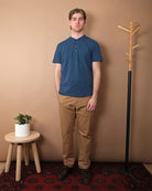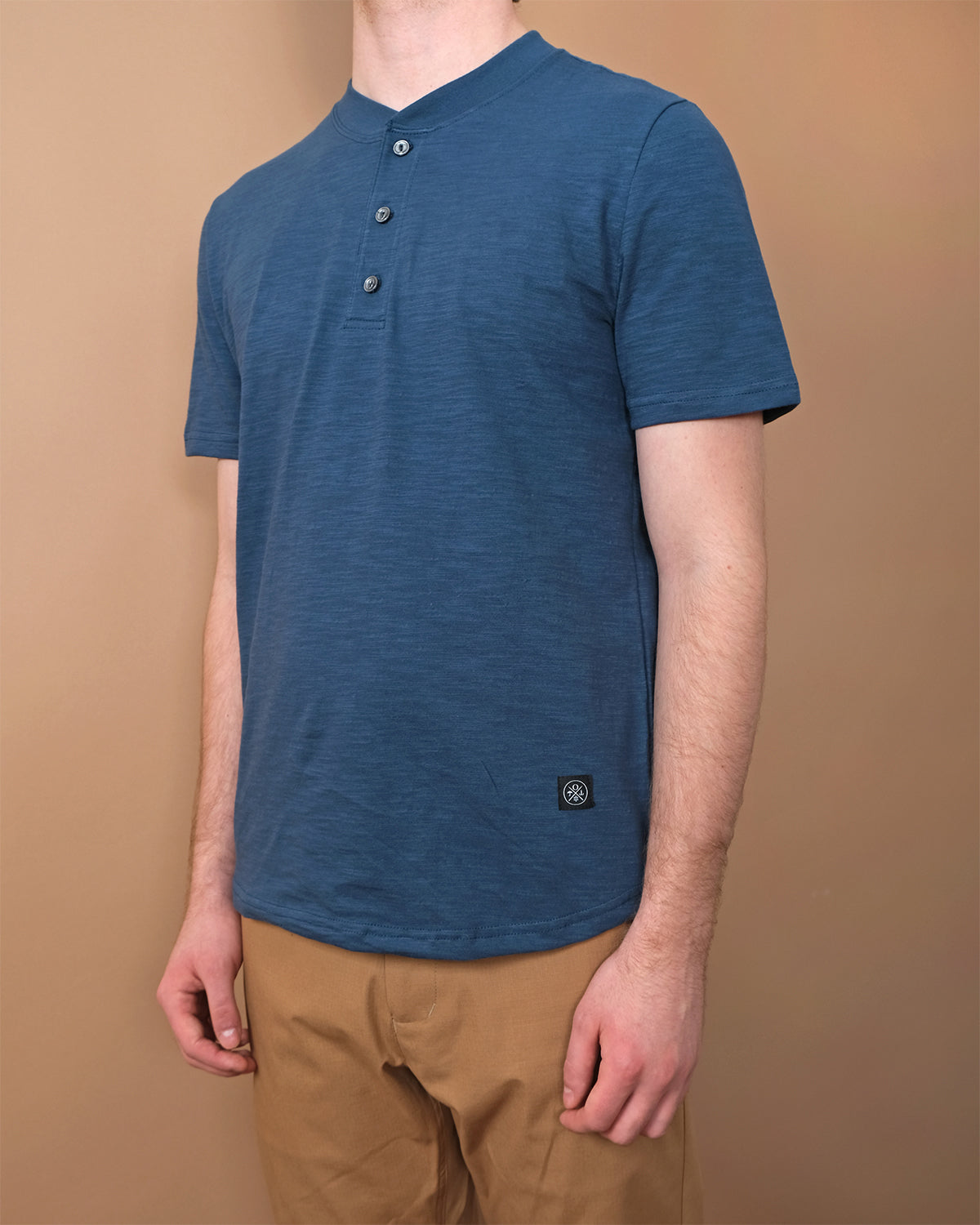 Crafted with pride, this S/S Henley is made from Toronto-milled slub fabric, dyed, cut, and sewn right here in Canada. With a rounded hem and grey cat's eye mother of pearl buttons, this henley combines local craftsmanship with everyday comfort and style.