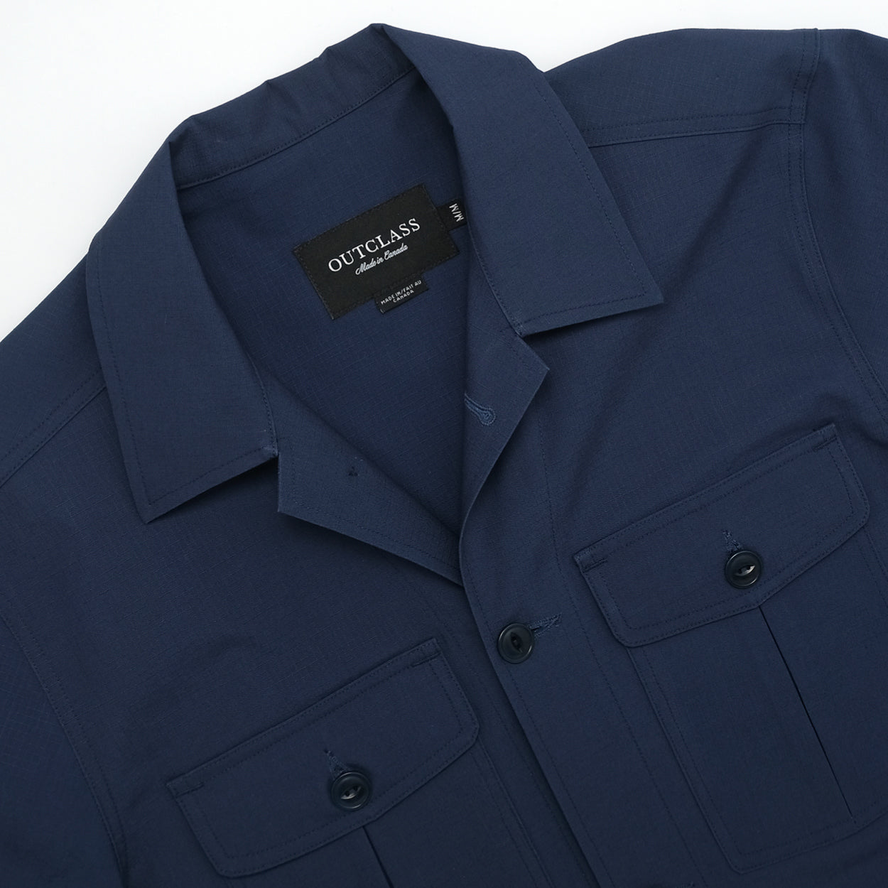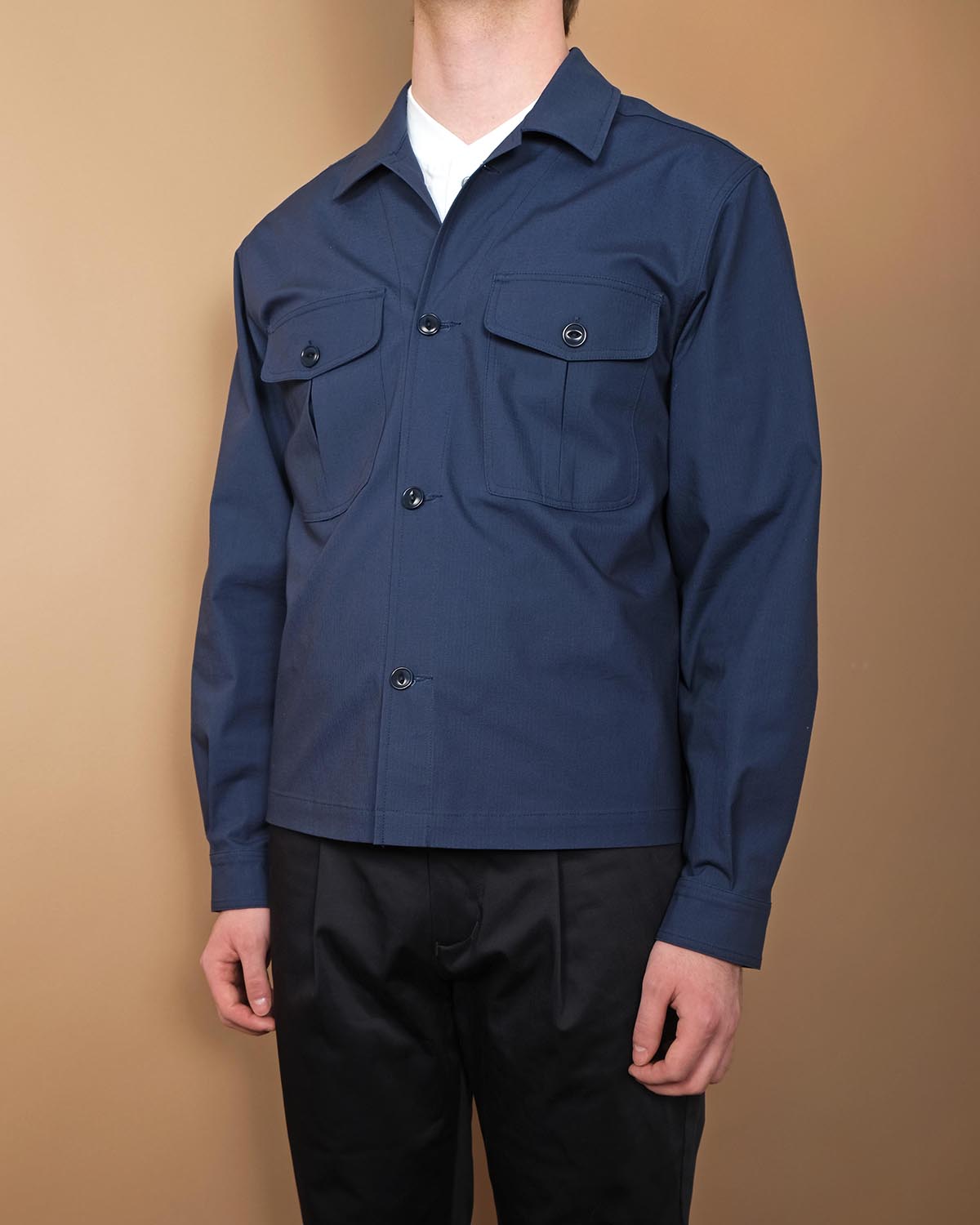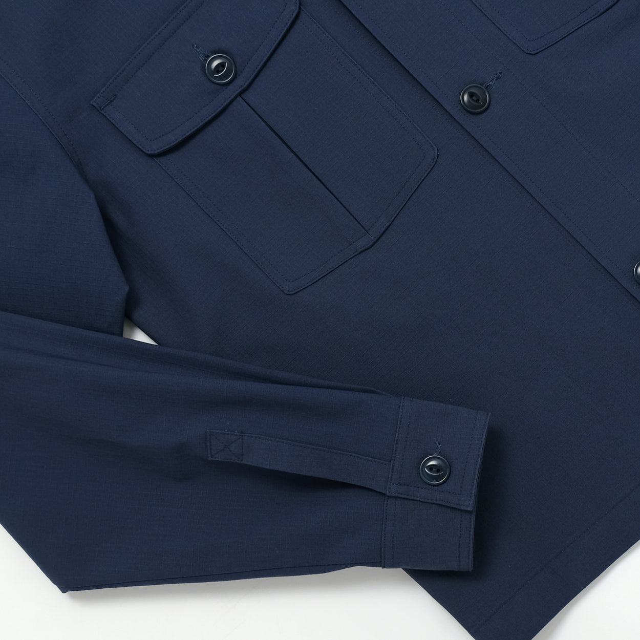 Introducing the Safari jacket, a fresh new silhouette for spring. Made from a crisp cotton ripstop from Spain with 2% stretch, it offers both durability and comfort. The relaxed fit, straight hem and spread collar create a laid-back look. Finished with navy corozo nut buttons and two pleated breast pockets, this jacket strikes the perfect balance of form and function.