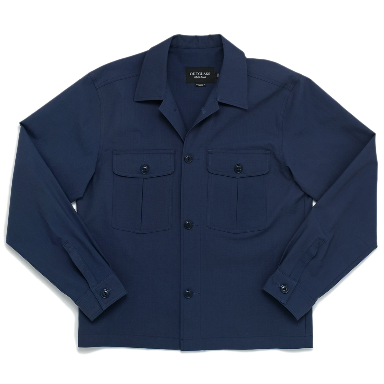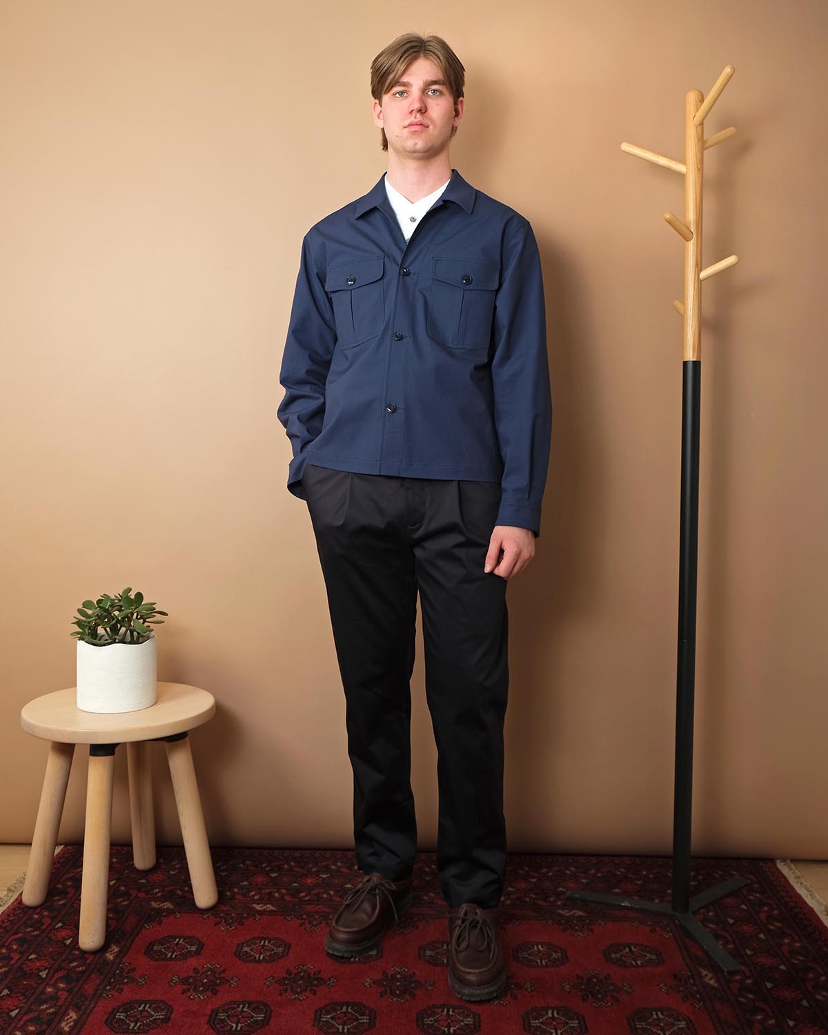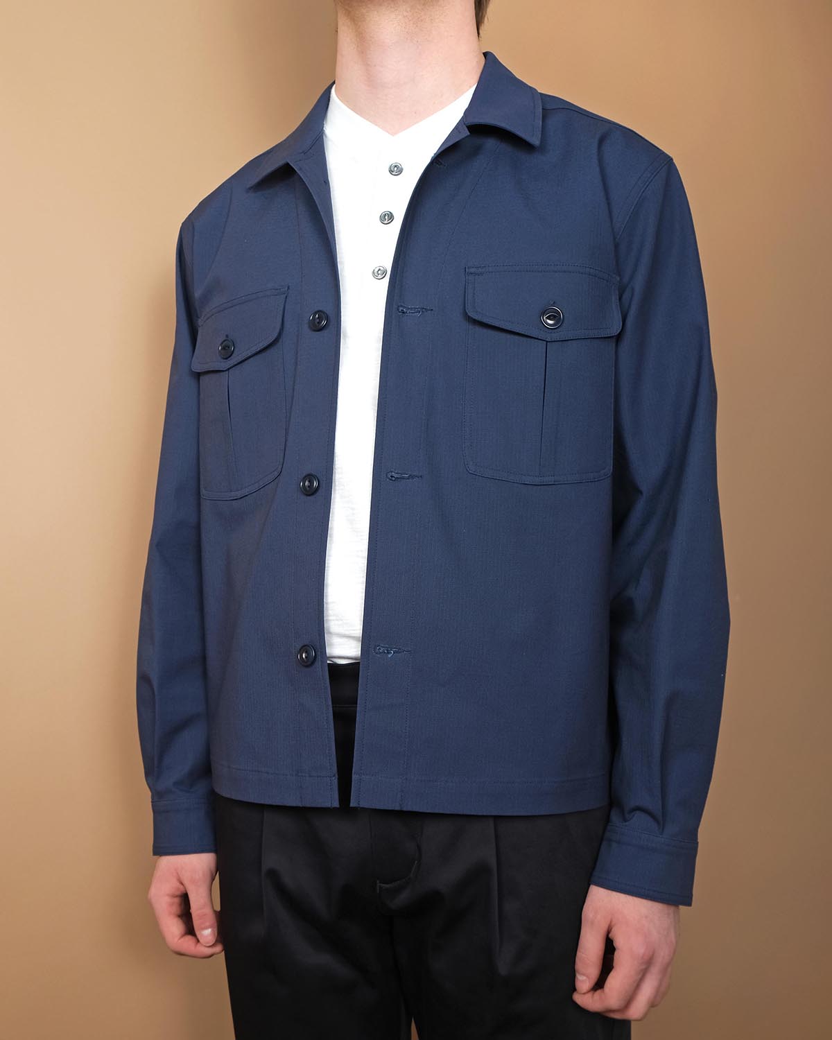 Introducing the Safari jacket, a fresh new silhouette for spring. Made from a crisp cotton ripstop from Spain with 2% stretch, it offers both durability and comfort. The relaxed fit, straight hem and spread collar create a laid-back look. Finished with navy corozo nut buttons and two pleated breast pockets, this jacket strikes the perfect balance of form and function.