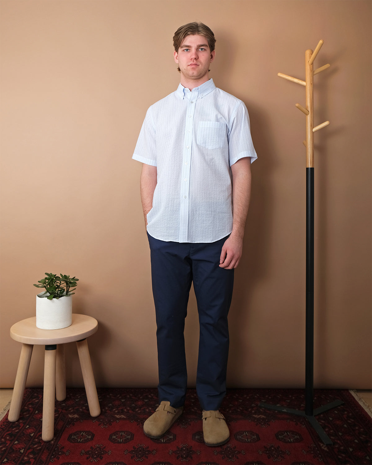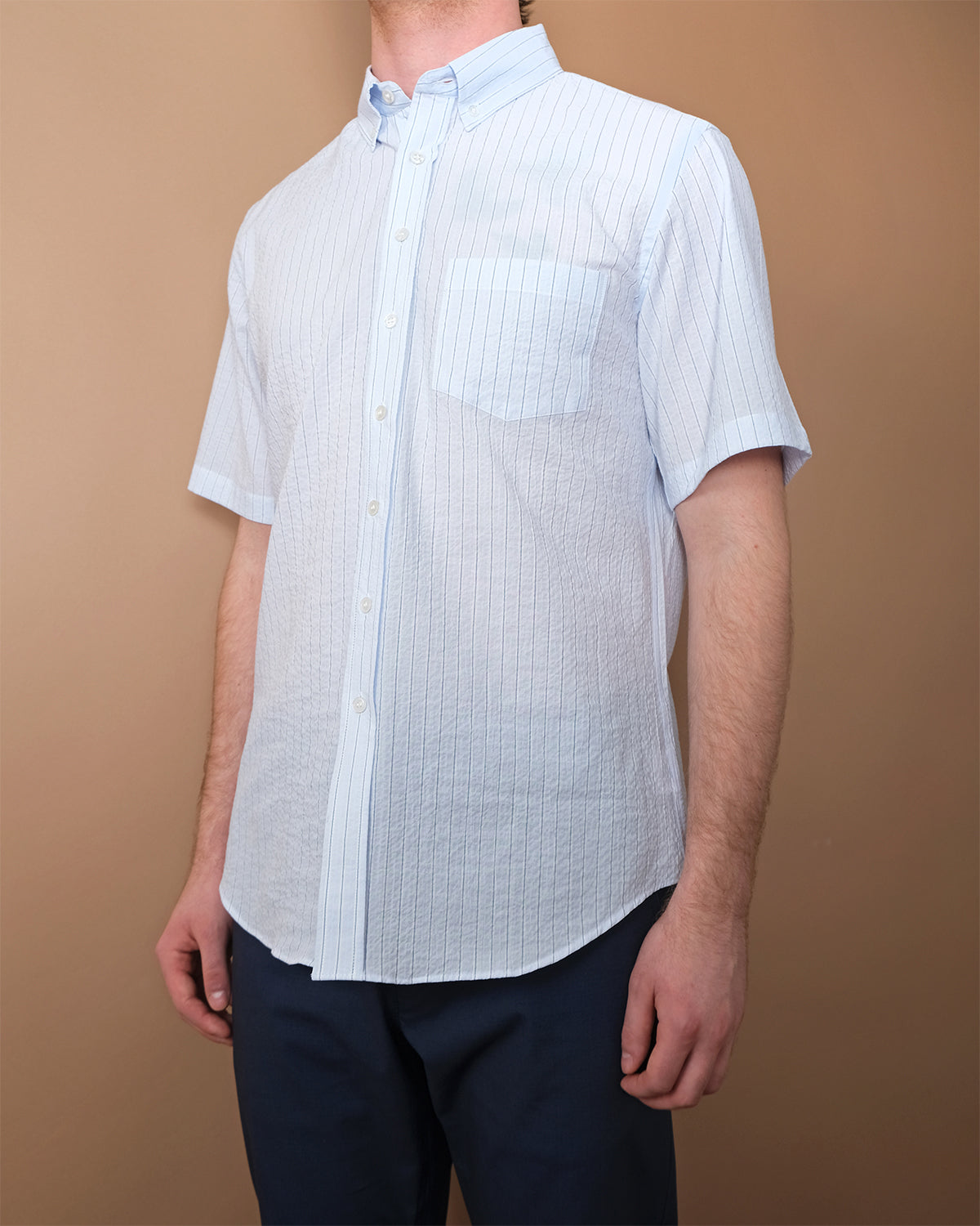 Timeless and easygoing, the Cloud Stripe S/S Classic Shirt is made from a Spanish seersucker cotton, featuring subtle vertical stripes for added depth and texture. Designed with a relaxed fit, button-down collar, and finished with white mother of pearl buttons, the shirt offers a laid-back yet polished look.