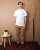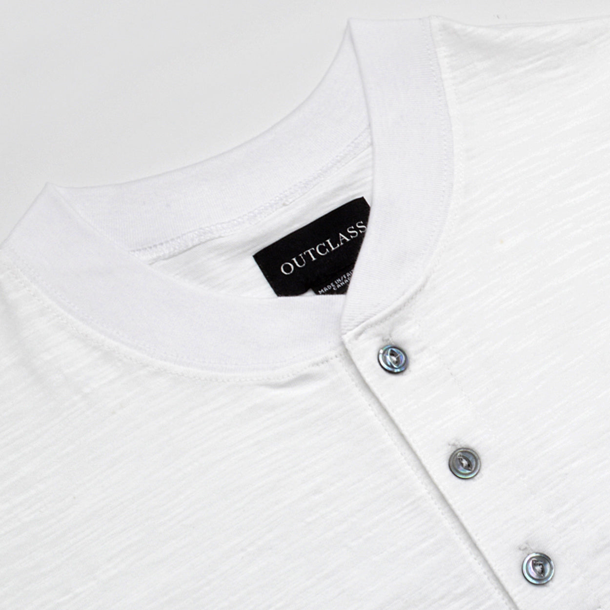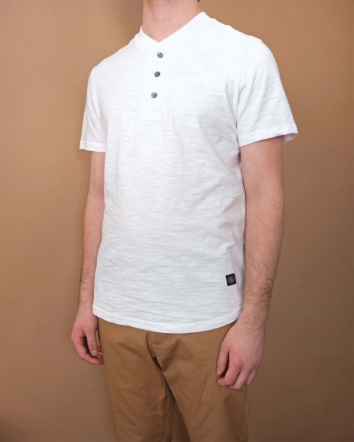 Crafted with pride, this S/S Henley is made from Toronto-milled slub fabric, dyed, cut, and sewn right here in Canada. With a rounded hem and grey cat's eye mother of pearl buttons, this henley combines local craftsmanship with everyday comfort and style.