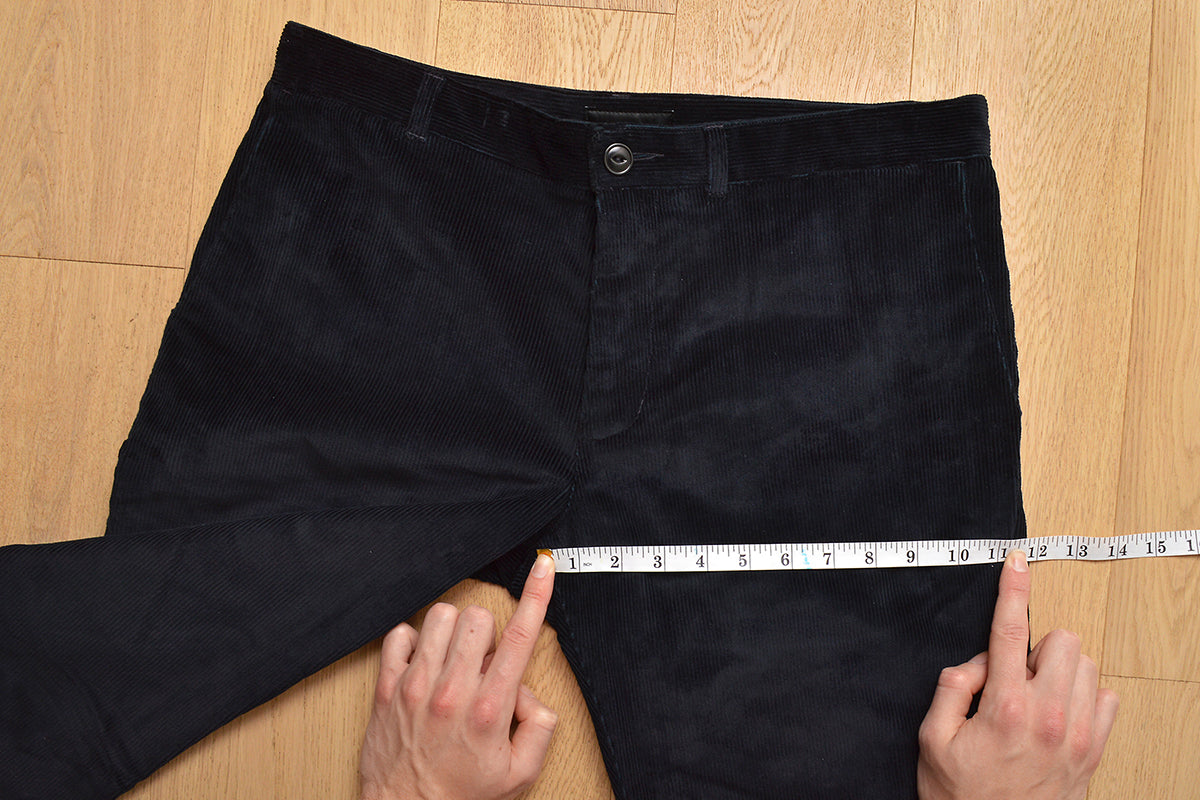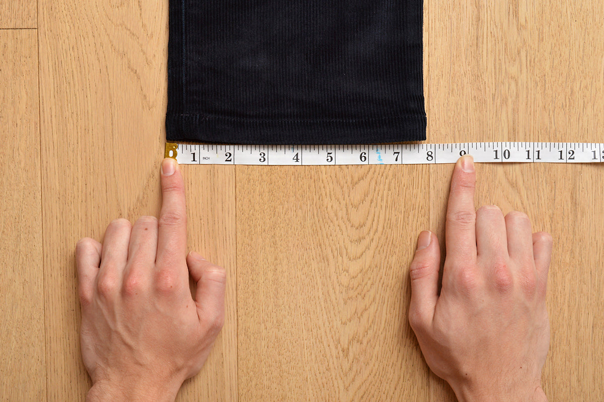 Gently smooth out the thigh of the pant to ensure that it is laying flat. Start from the crotch seam and measure across the thigh.