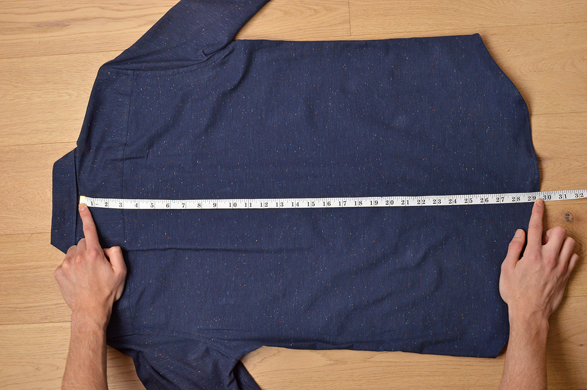 This measurement can be taken while the garment is face up or face down. Measure from the bottom of the collar seam to the very bottom of the garment.