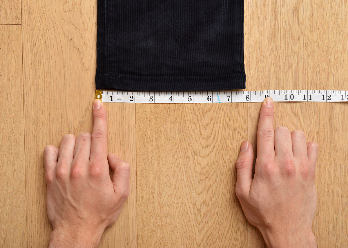 Gently smooth out the thigh of the pant to ensure that it is laying flat. Start from the crotch seam and measure across the thigh.
