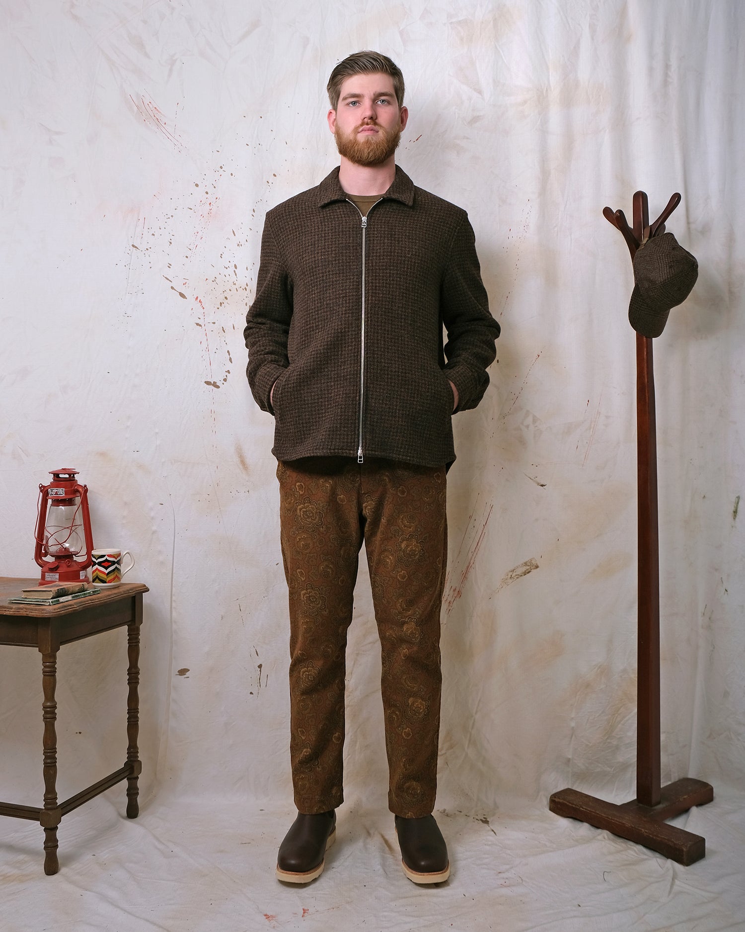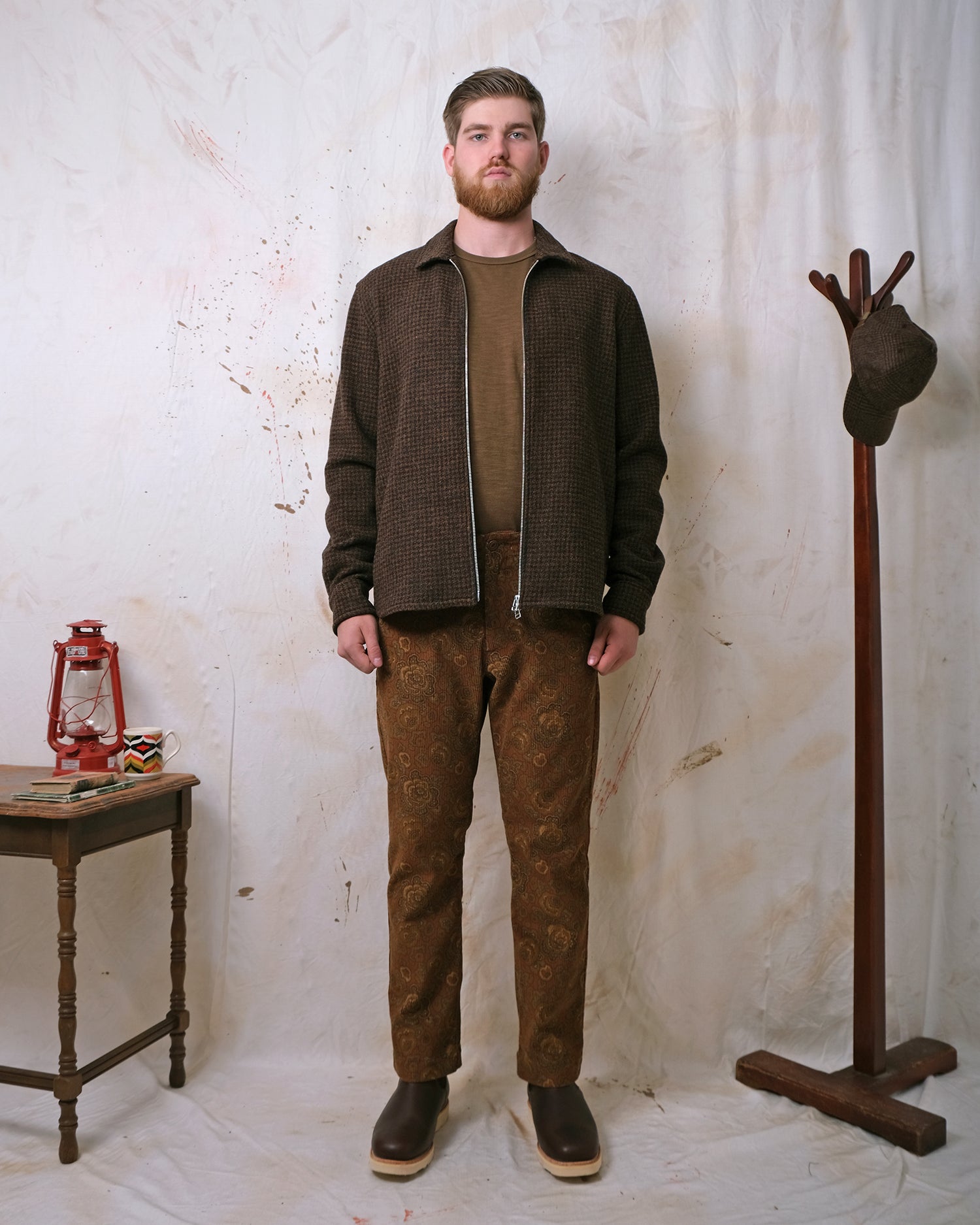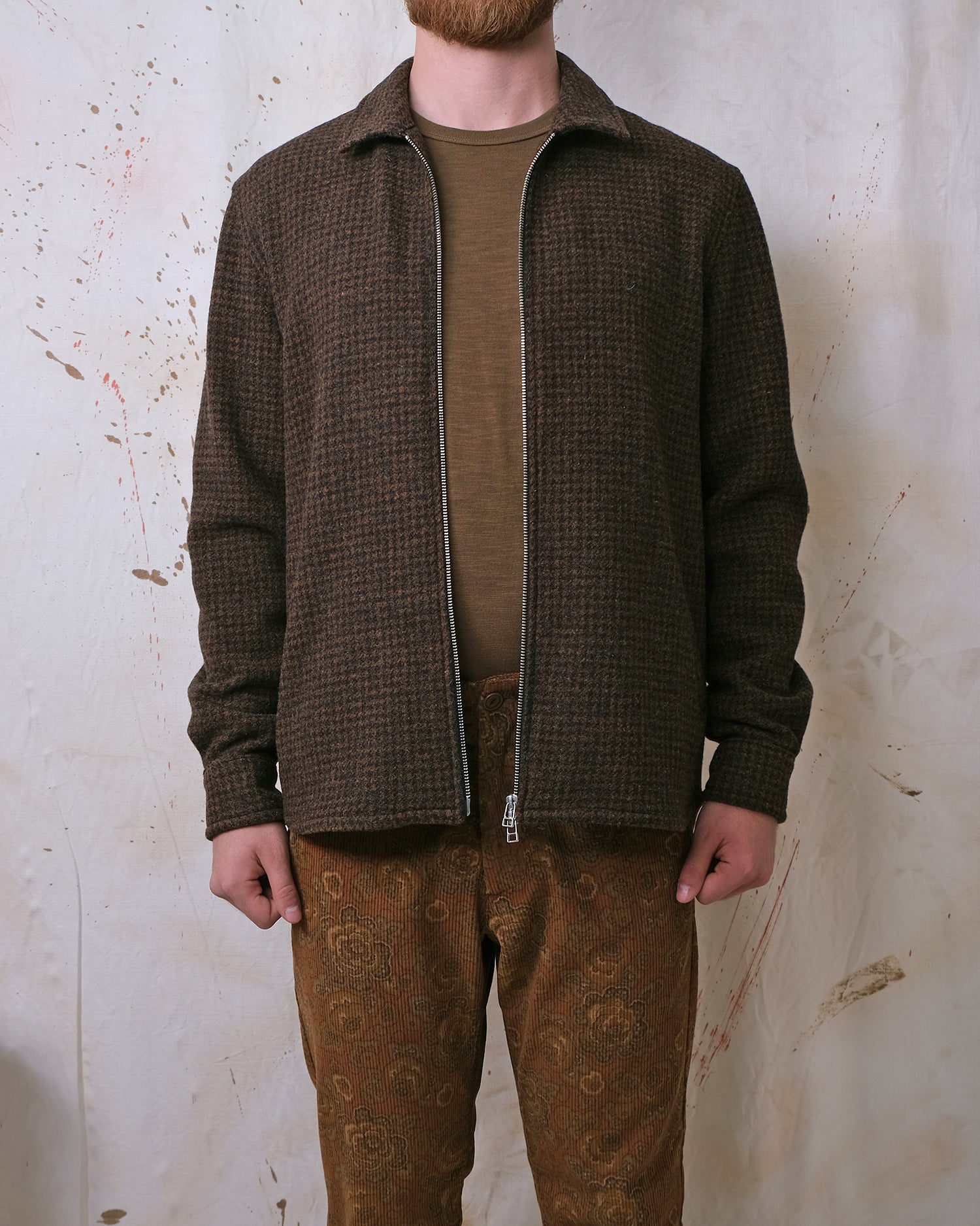 The Bronze Houndstooth Wool Zip Overshirt showcases a luxurious tweed-like wool from Italy, adorned with a classic houndstooth design. This piece offers a relaxed silhouette, complemented by flannel-lined single-welt hand pockets, a two-way YKK zipper and an extended shirt-tail hem for refined functionality.