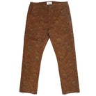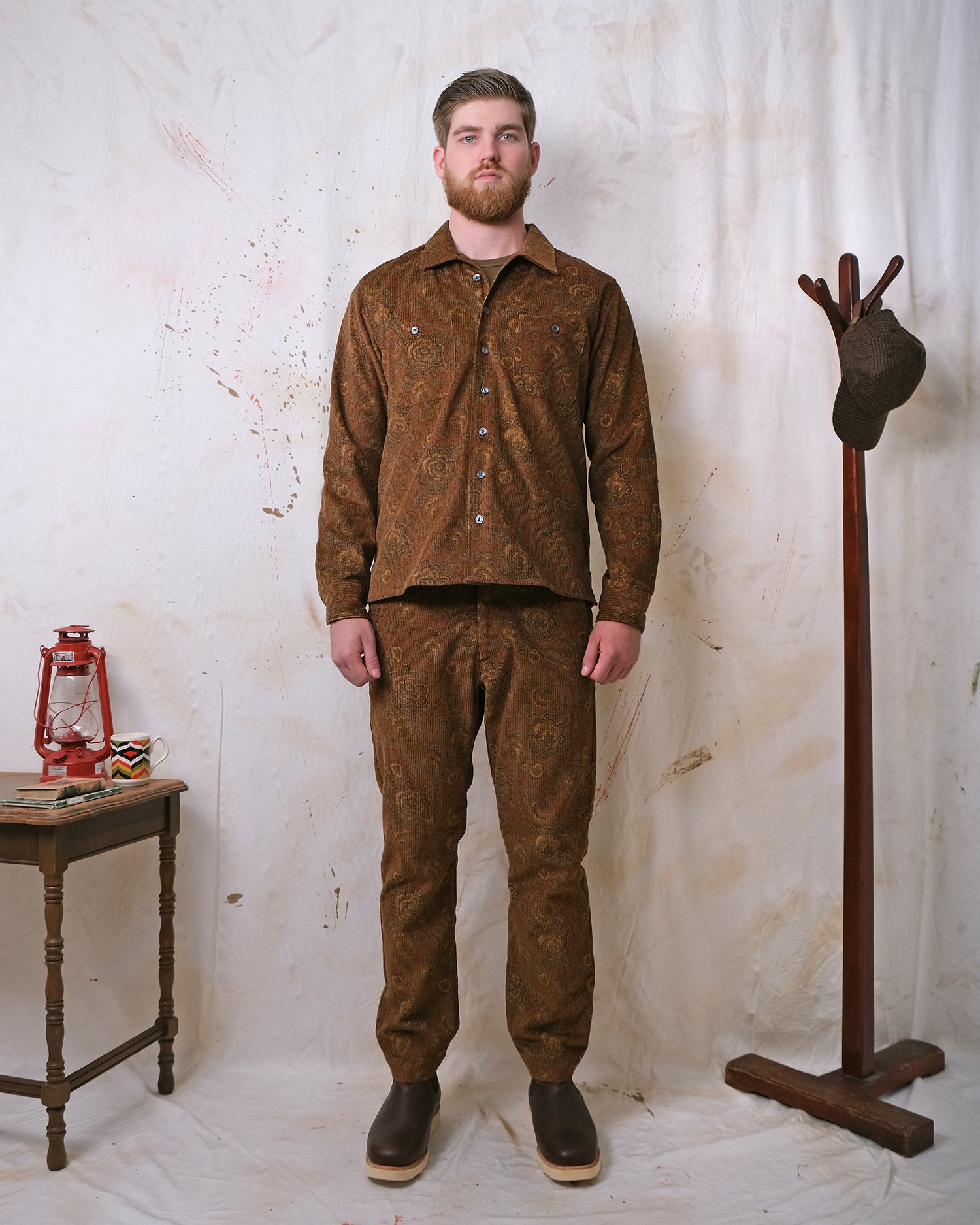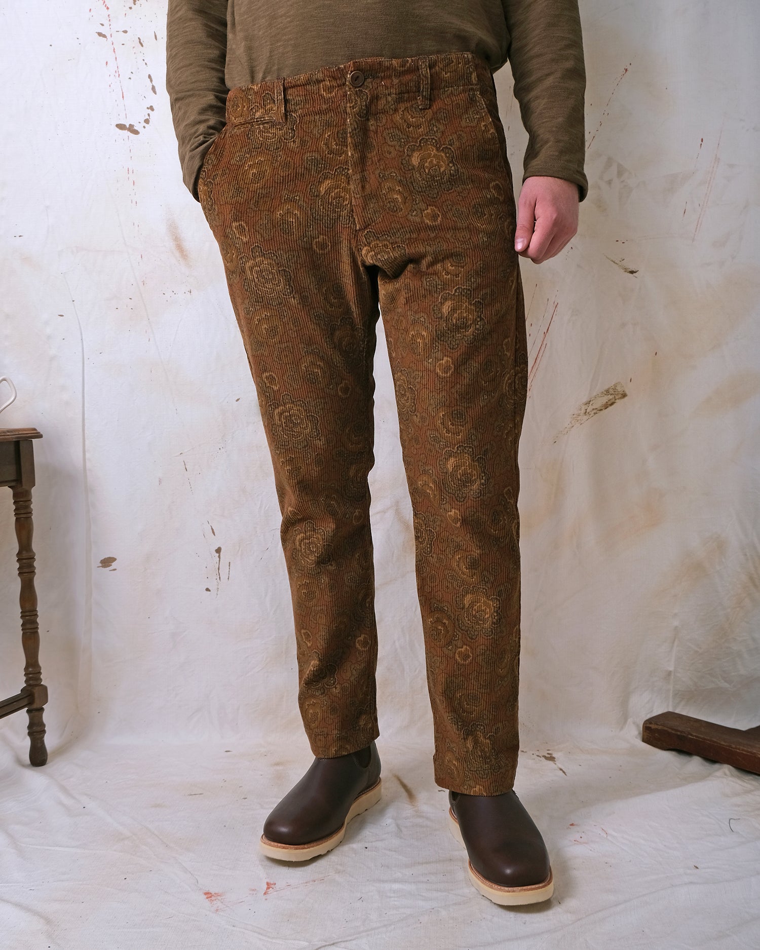 The Bronze Printed Corduroy Camp Pant, crafted from premium Japanese corduroy featuring a striking abstract floral pattern. Designed for a relaxed fit, these pants ensure comfort and effortless wear. Thoughtful details like a zipper fly, double-welt rear pockets, a hidden coin pocket, and corozo nut button closure add practicality while showcasing refined craftsmanship.