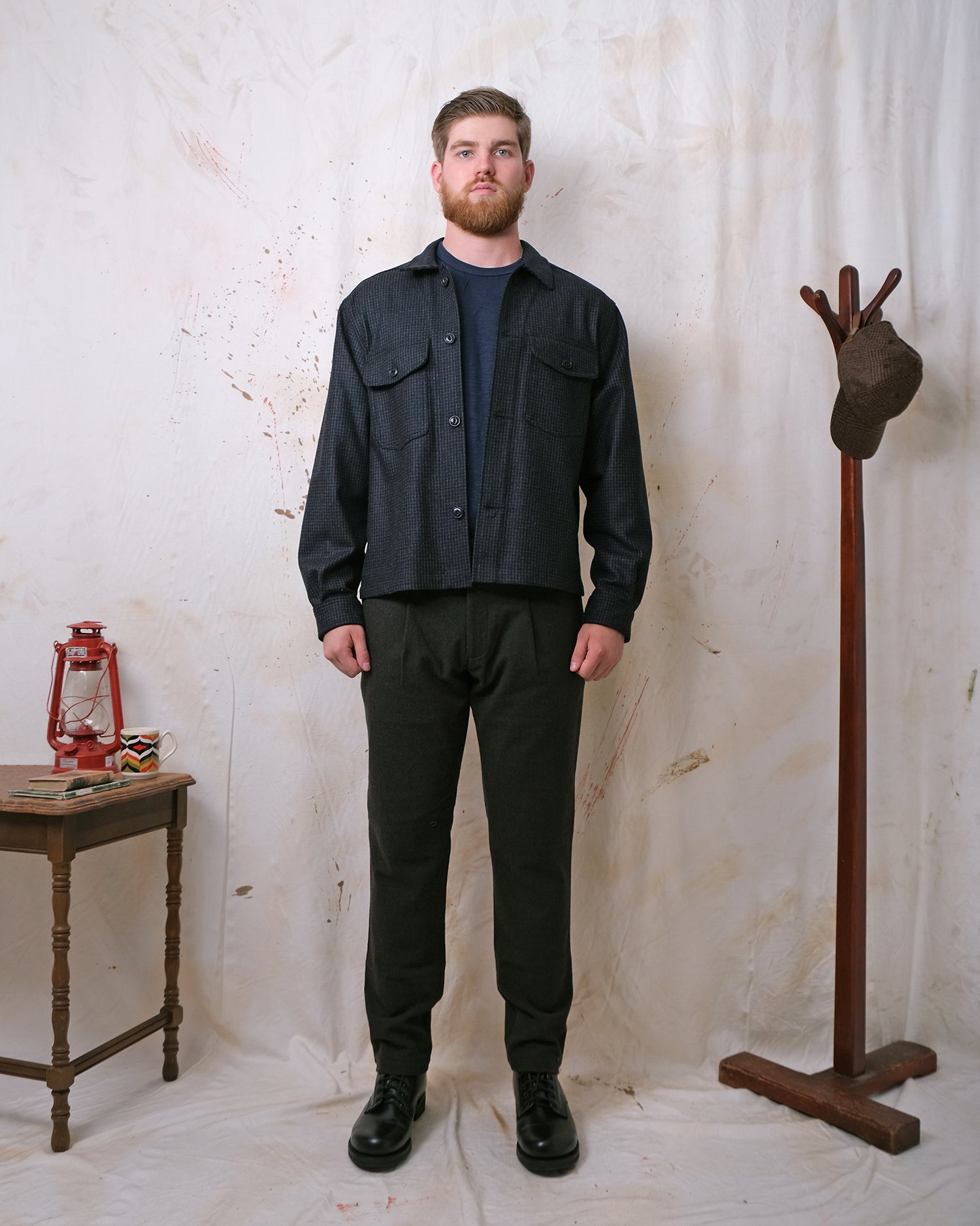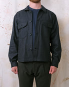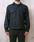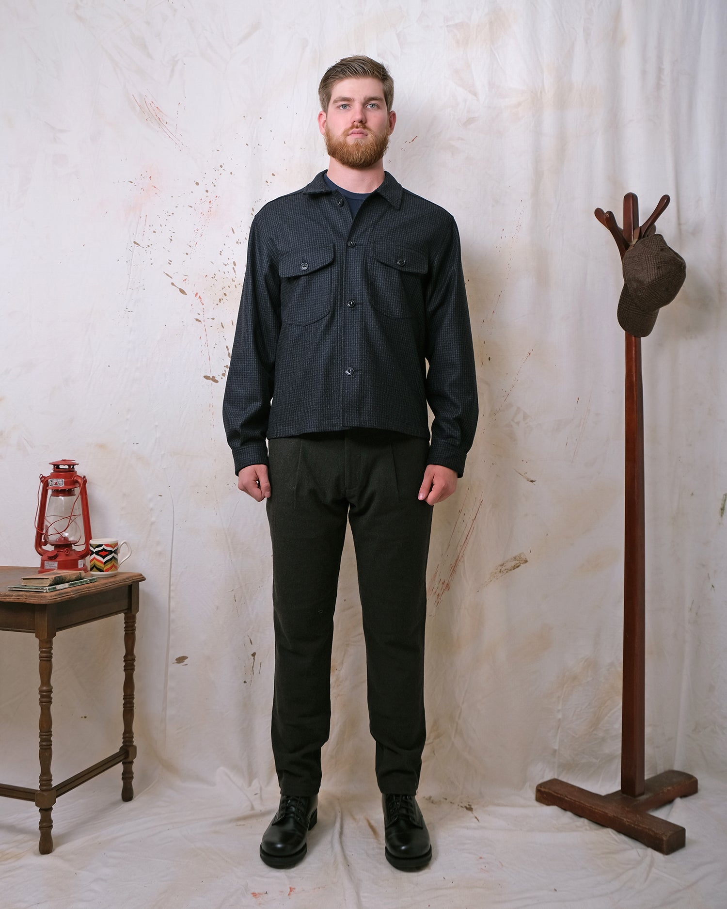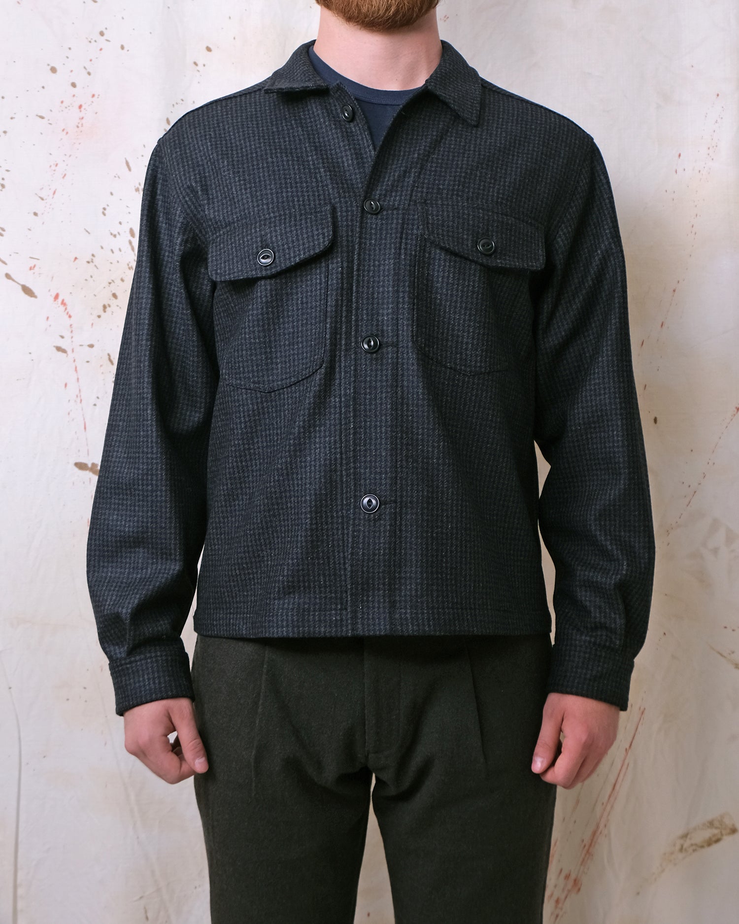 Experience the exceptional comfort of the Charcoal Houndstooth Camp Shirt, crafted from ultra-soft Italian wool with a classic houndstooth pattern. Its relaxed fit, convenient flap-closure breast pockets, and stylish black corozo nut buttons make it a must-have for effortless style and practicality.