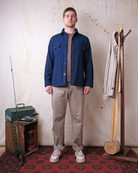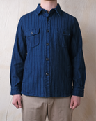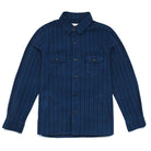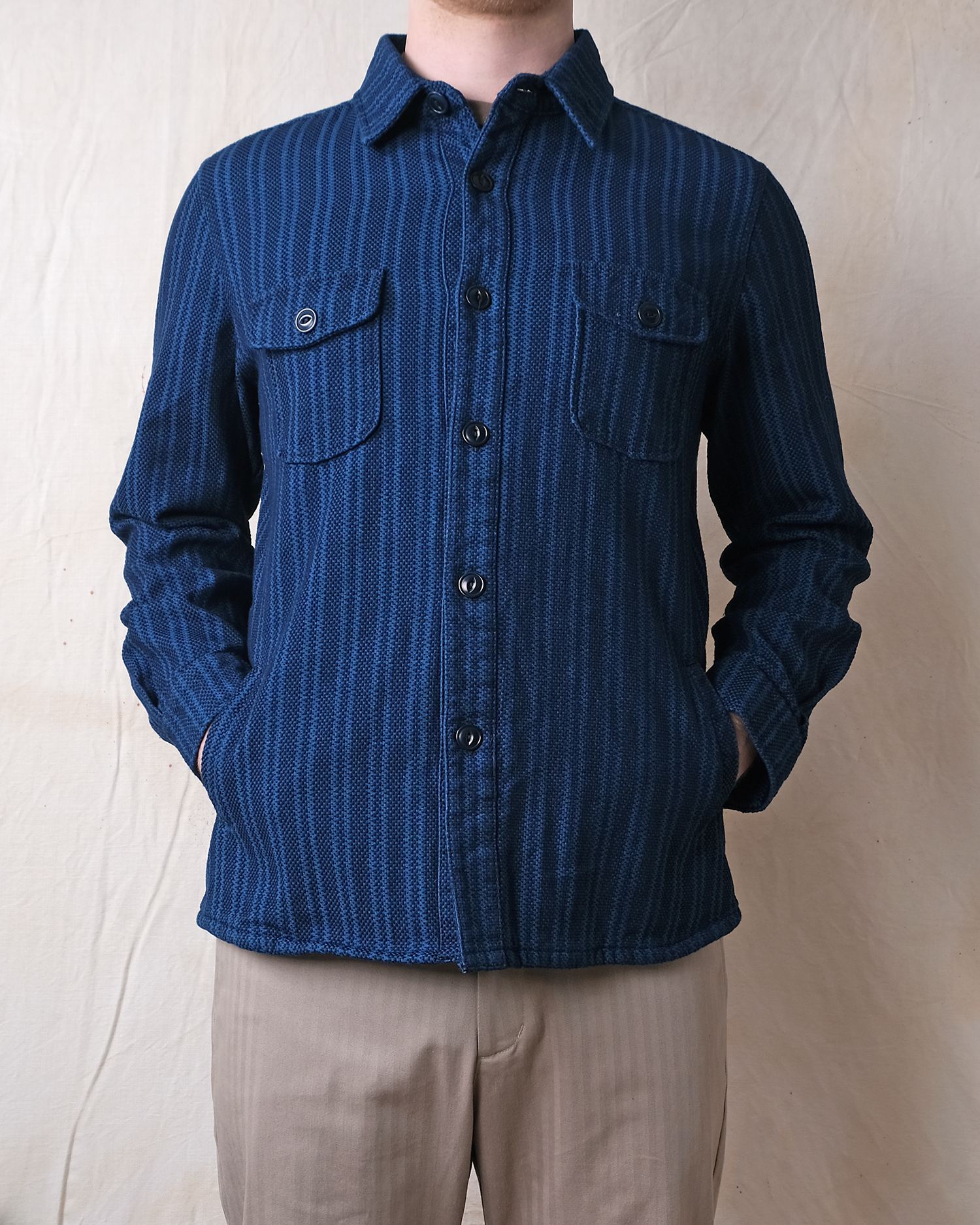 This overshirt is crafted from a Japanese cotton sashiko fabric woven with a distinctive stripe pattern. Indigo dyed and garment washed, the fabric is softened and subtly faded, giving the piece a worn-in feel. Designed with two hand pockets, two breast pockets, and finished with corozo nut buttons, this is a thoughtfully constructed layer with texture and character. Indigo dye may transfer during the first few wears. Avoid pairing with light-coloured garments initially.